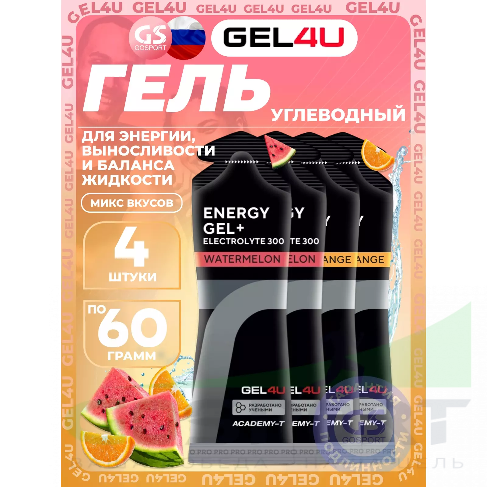 GEL4U Energy Gel MIX 4 x 60 г, Апельсин, Арбуз — Энергия, выносливость и баланс жидкости