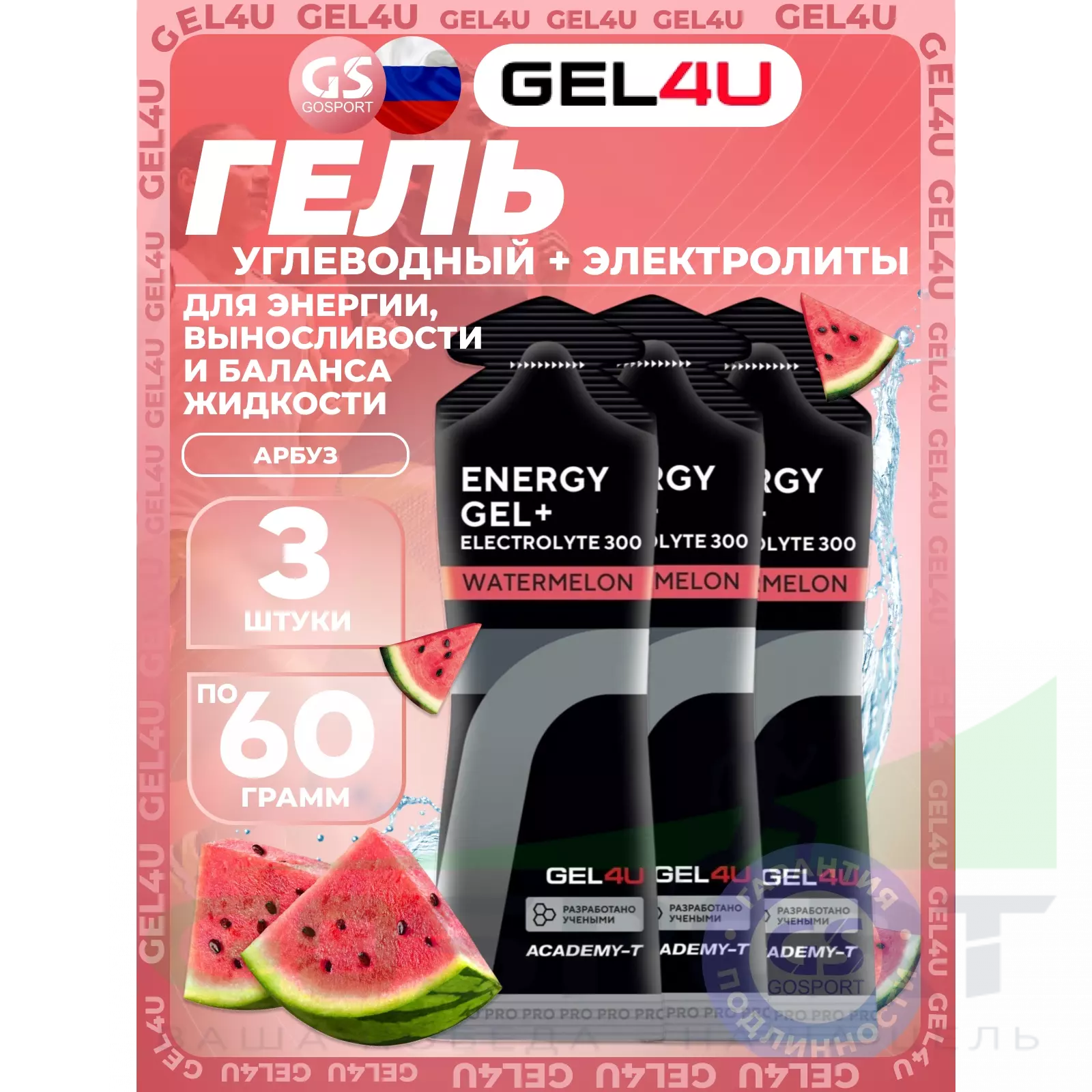 GEL4U Energy GEL + Electrolyte 300 3 x 60 г, Арбуз — Энергия, выносливость и баланс жидкости
