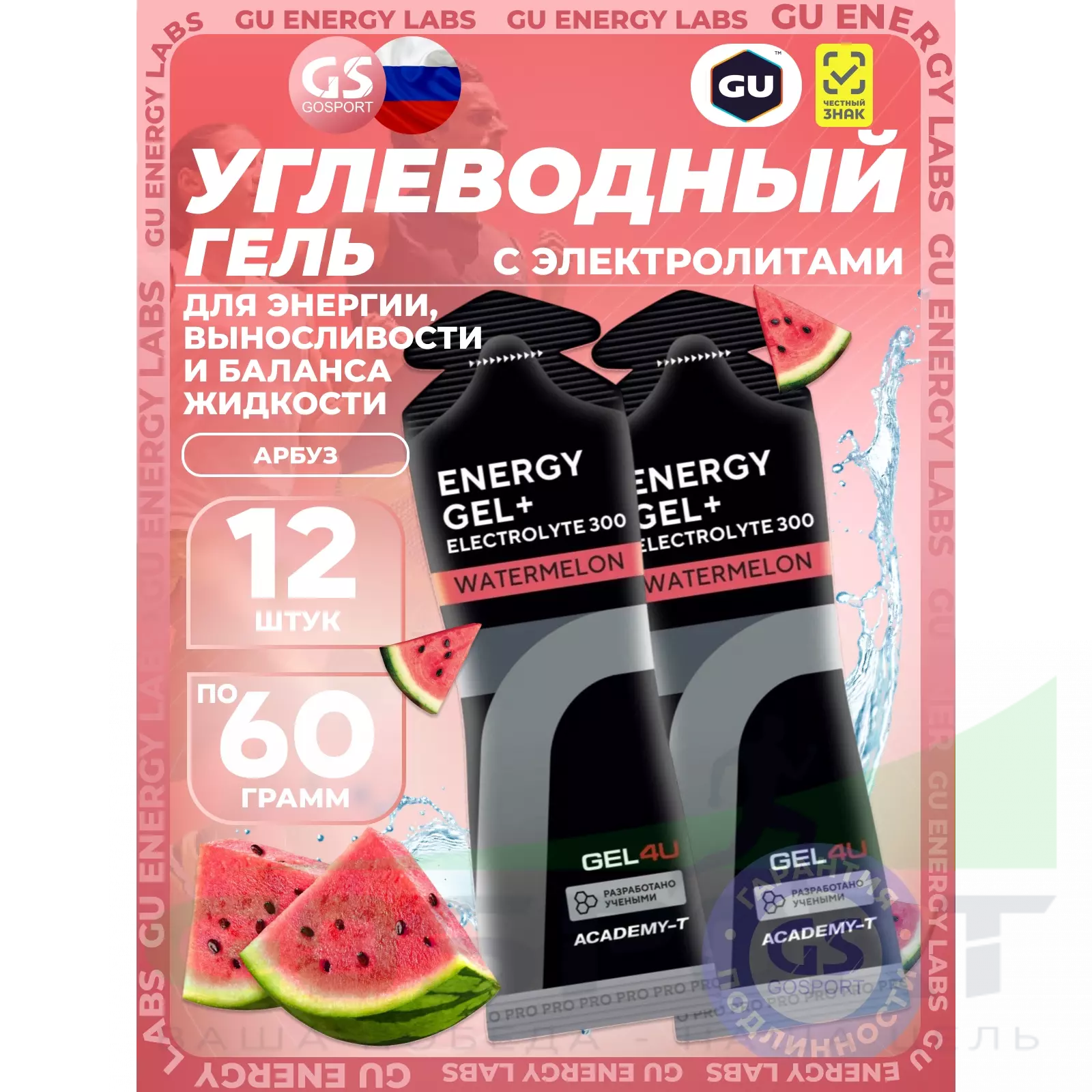 GEL4U Energy GEL + Electrolyte 300 12 x 60 г, Арбуз — Энергия, выносливость и баланс жидкости