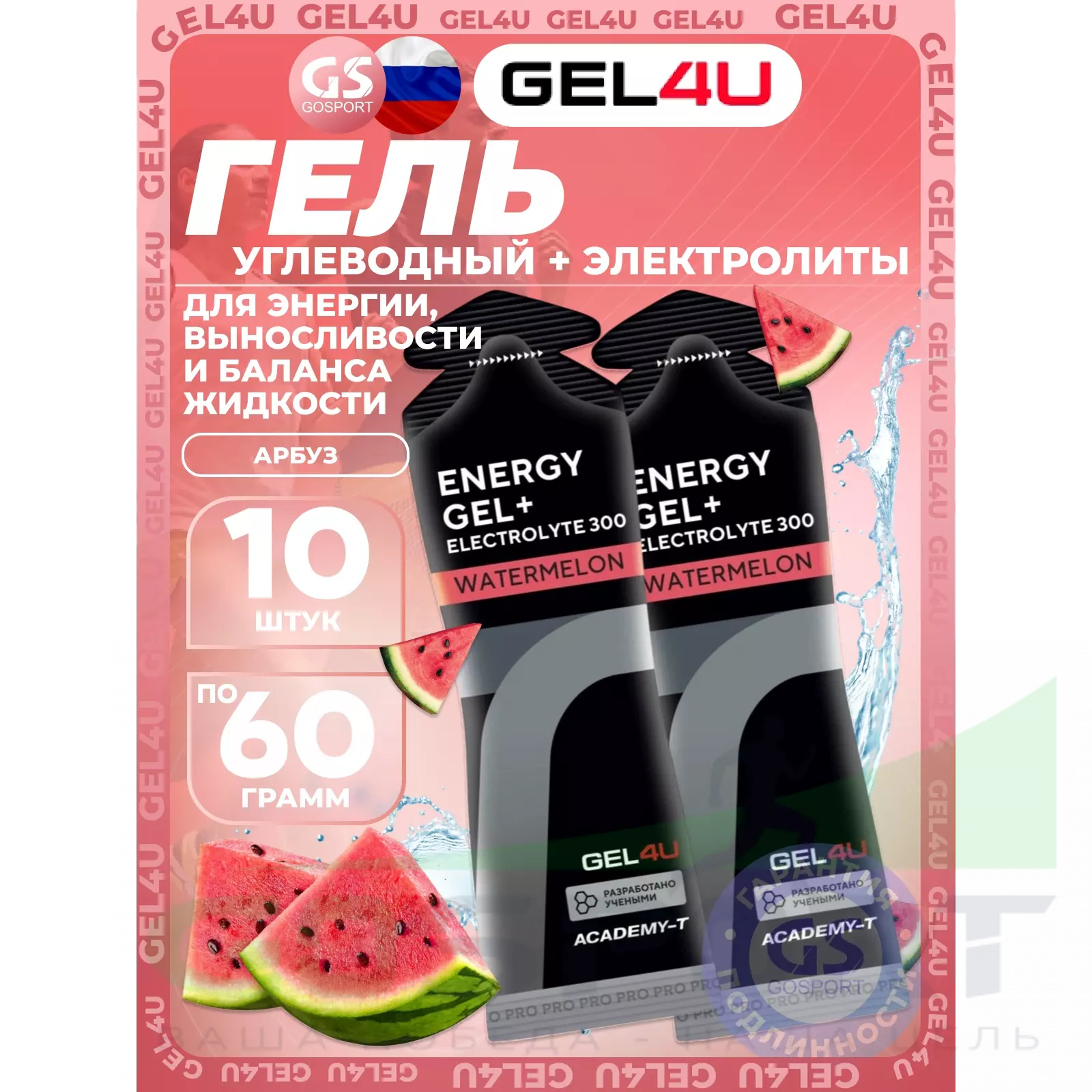 GEL4U Energy GEL + Electrolyte 300 10 x 60 г, Арбуз — Энергия, выносливость и баланс жидкости
