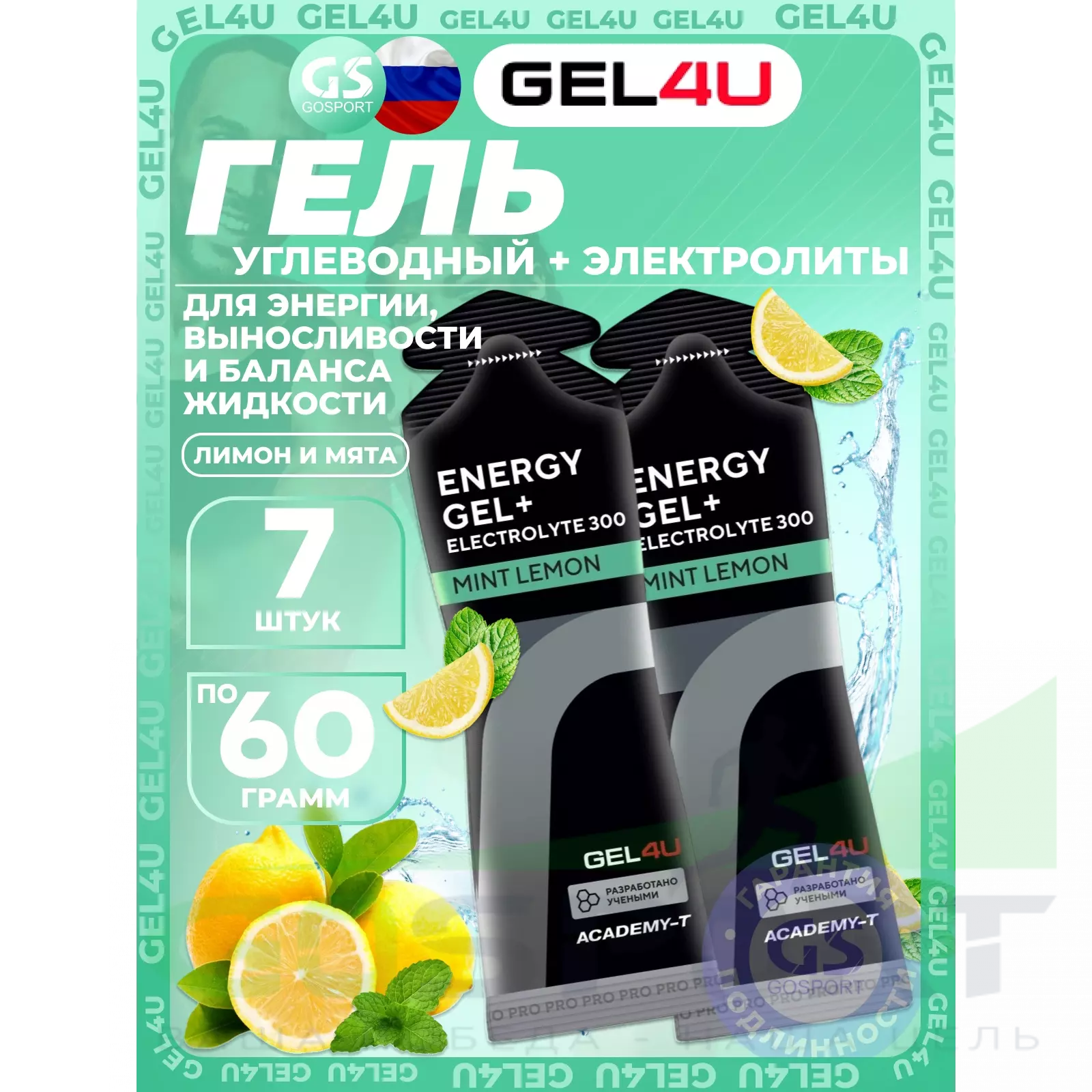 GEL4U Energy GEL + Electrolyte 300 7 x 60 г, Лимон и Мята — Энергия, выносливость и баланс жидкости
