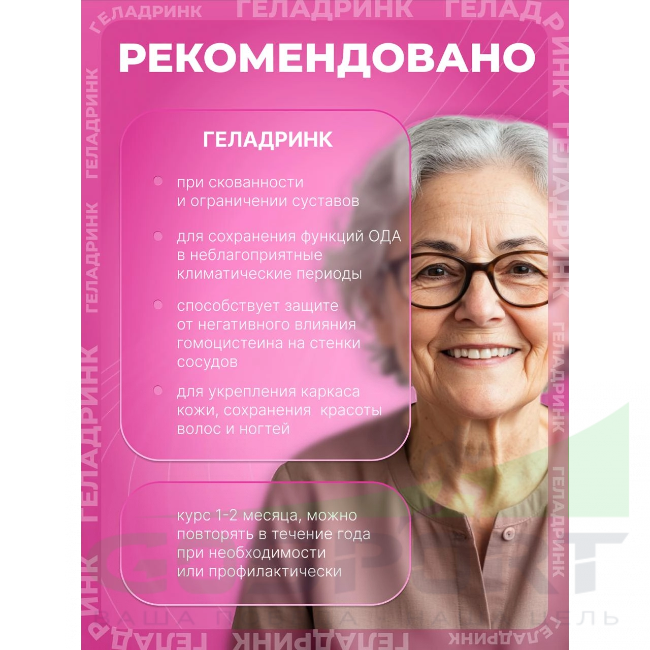 Хондропротектор, который выполняет функцию восстановления нормального метаболизма хрящевой ткани, стимулирует процесс синтеза естественного коллагена, повышает антиоксидантную защиту и обеспечивает суставы и позвоночник дополнительными питательными веществами. «Геладринк Форте» используется как средство профилактики и комплексной терапии заболеваний ОДА (остеоартрозы, остеохондрозы, межпозвоночные грыжи, тендиниты, спондилит, спондилез, остеопороз и др.).