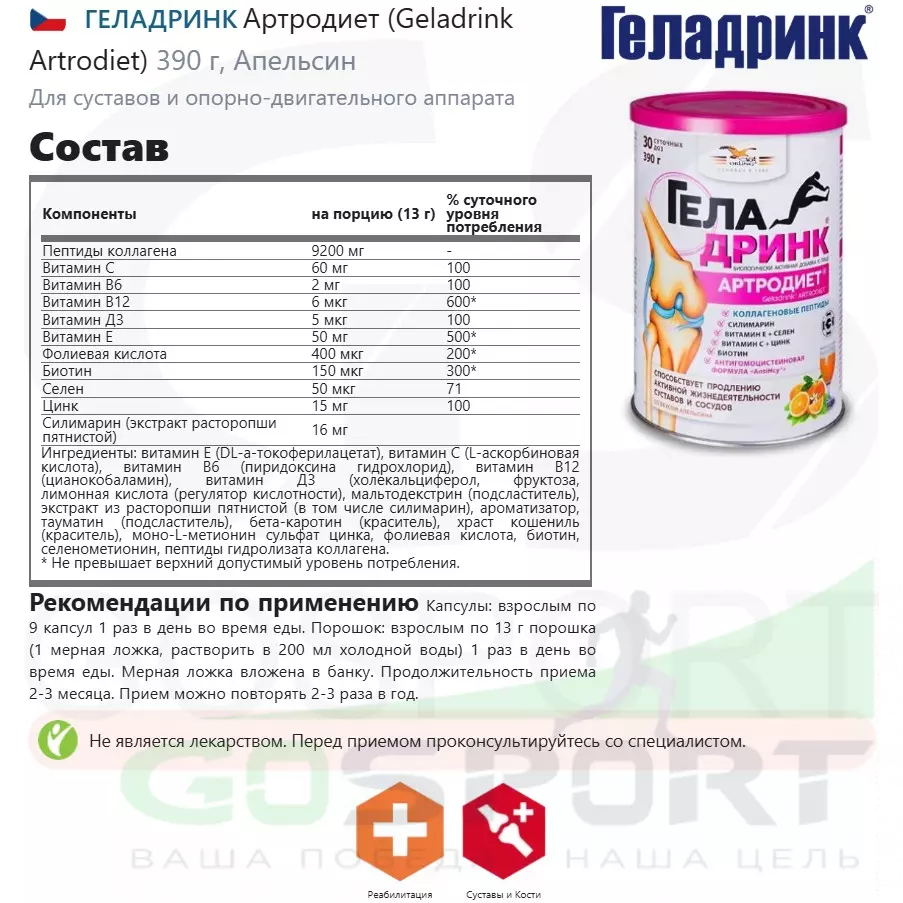 Геладринк® Артродиет® («Geladrink® Artrodiet®») содержит оптимальный комплексный состав для питания суставов, позвоночника и сосудов и продления их активной жизнедеятельности. Область применения: в качестве биологически активной добавки к пище, содержащей коллаген, дополнительного источника витаминов (С, В6, В12, Д3, Е, фолиевой кислоты, биотина), селена, цинка, источника флавоноидов.лее клинические исследования, табличка с составом и описание состава.