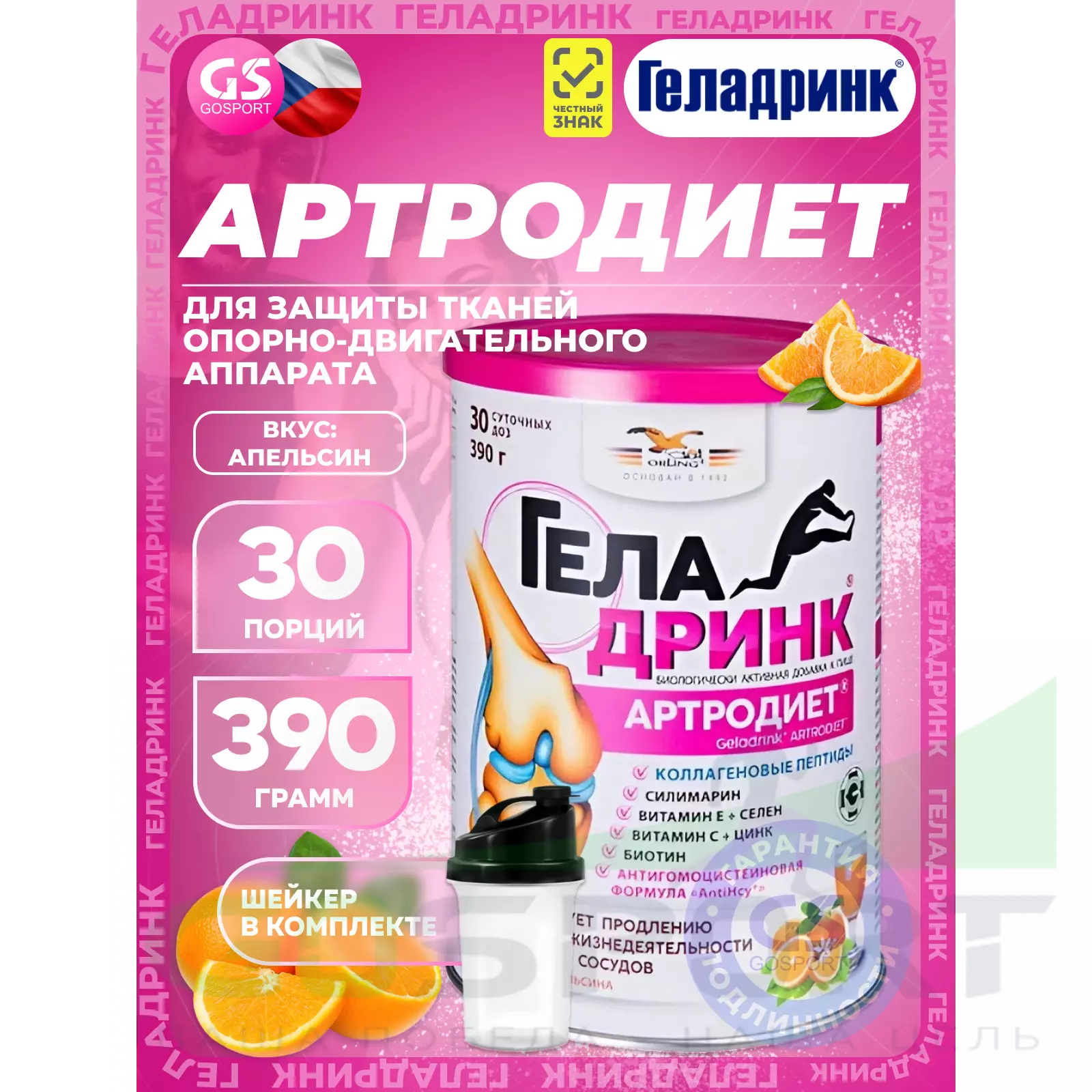ГЕЛАДРИНК Артродиет (Geladrink Artrodiet) + Шейкер 390 г + шейкер, Апельсин — Для суставов и опорно-двигательного аппарата
