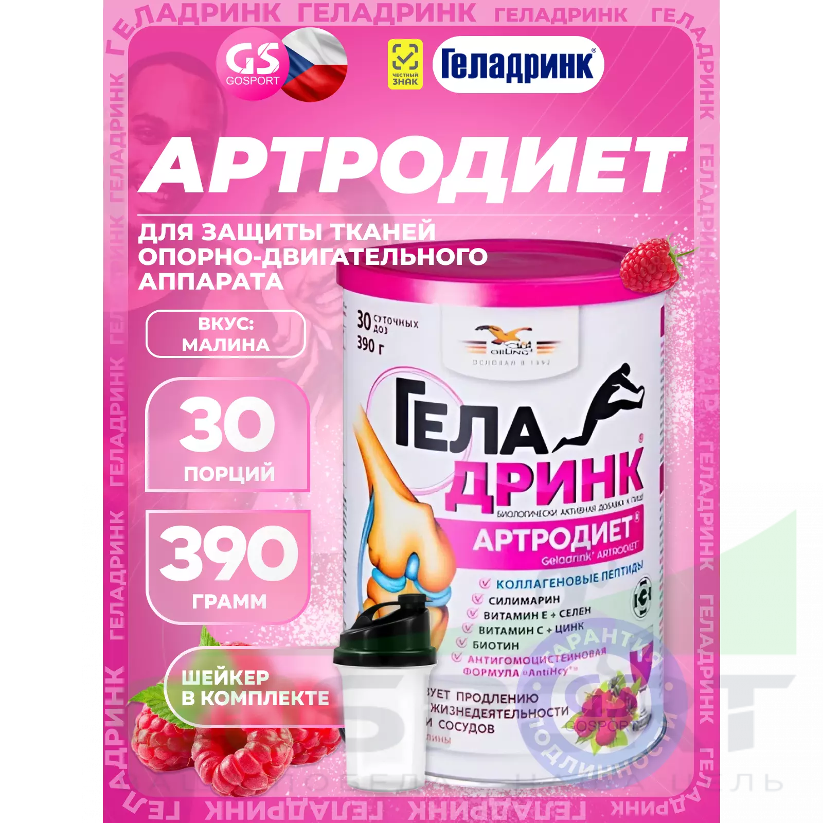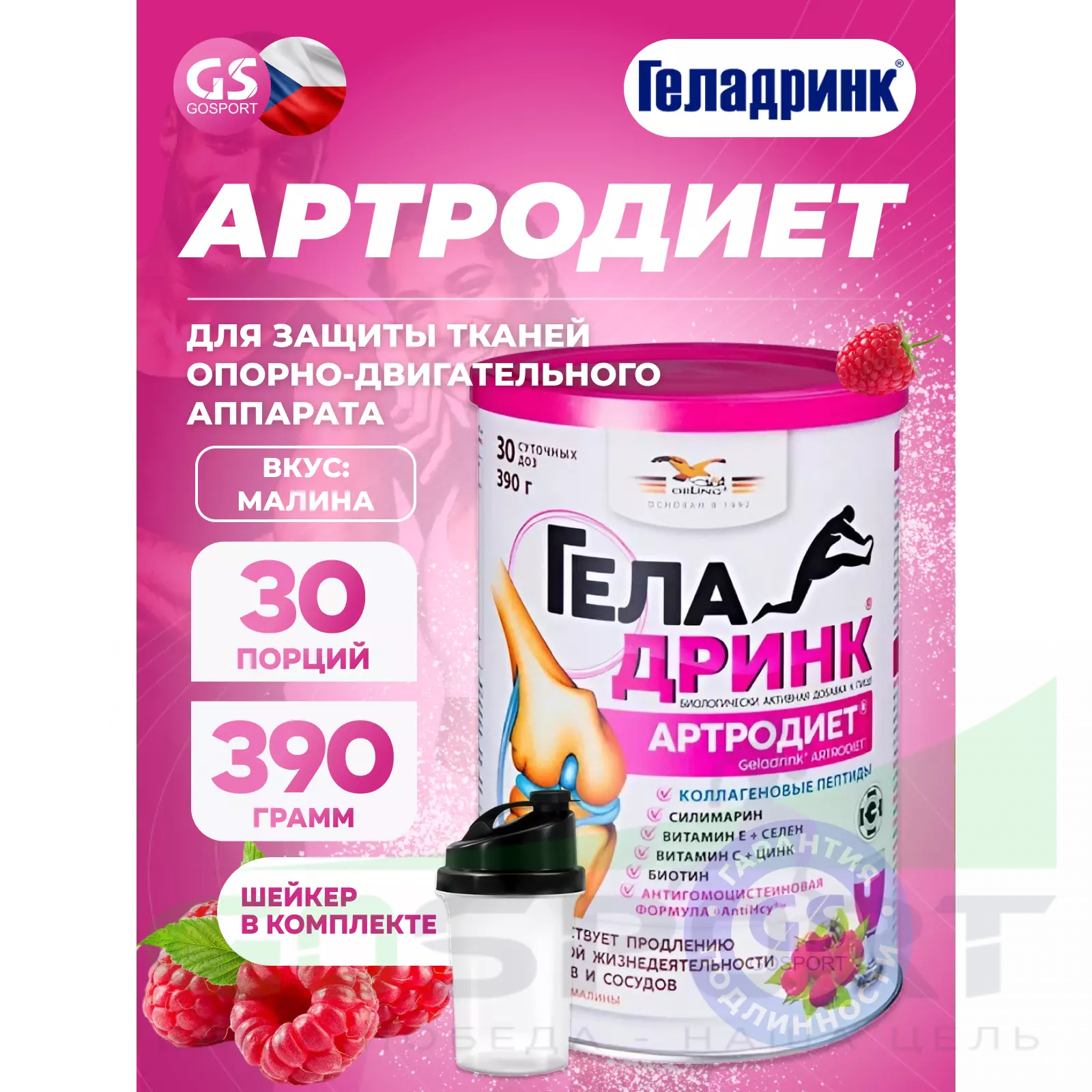 ГЕЛАДРИНК Артродиет (Geladrink Artrodiet) + Шейкер 390 г + шейкер, Малина — Для суставов и опорно-двигательного аппарата