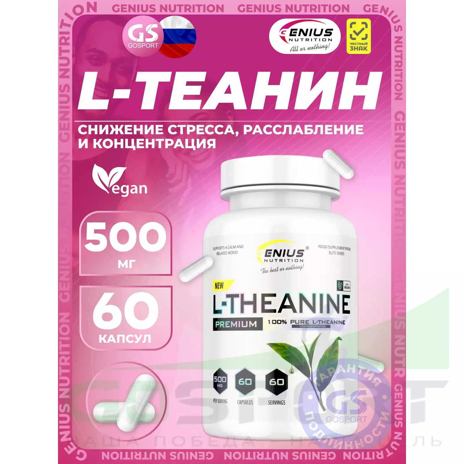 Genius Nutrition L-Theanine 500 mg 60 капсул — Снижение стресса, расслабление и концентрация