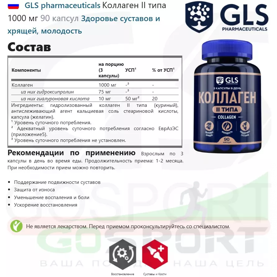 Описание GLS pharmaceuticals Коллаген II типа 1000 мг
