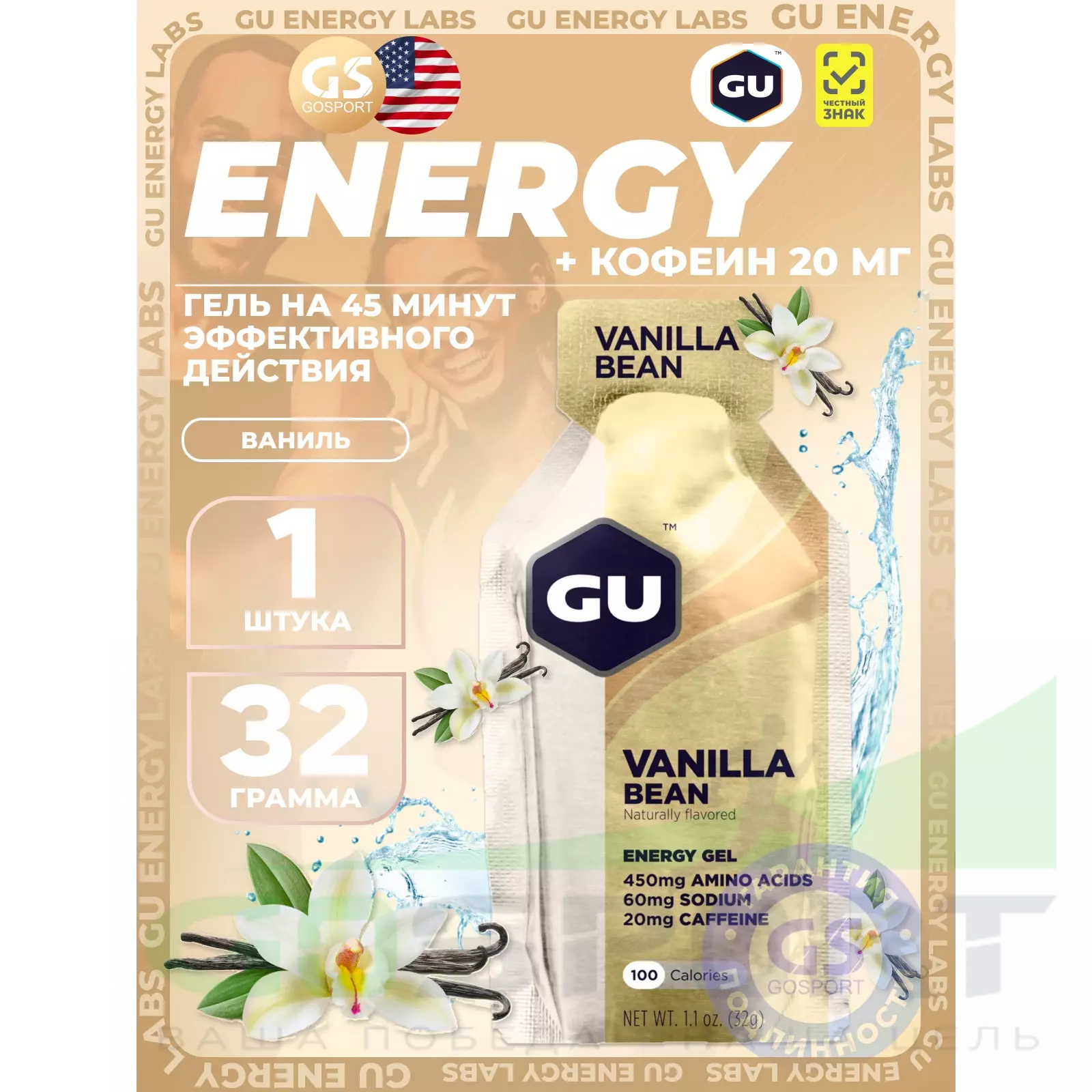 GU Energy Labs GU Original Energy Gel 20mg caffeine 32 г, Ваниль