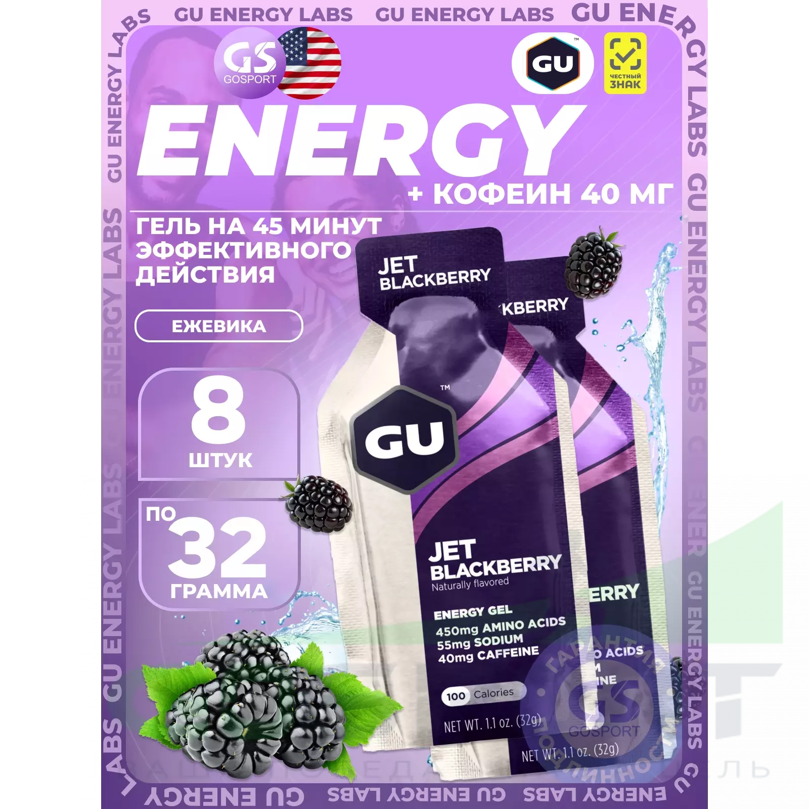 GU Original Energy Gel 40mg caffeine 8 x 32 г, Ежевика Джет