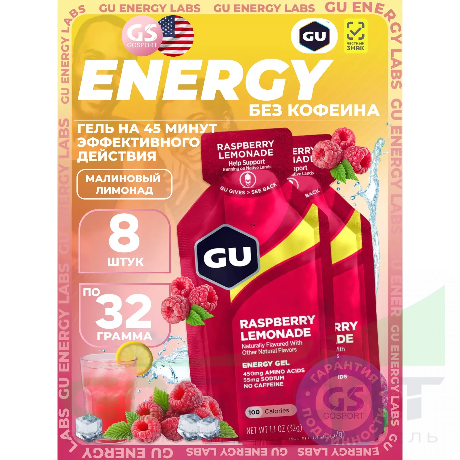 GU Energy Labs GU Original Energy Gel no caffeine 8 x 32 г, Малиновый лимонад — Высокая калорийность, два вида углеводов, лёгкий