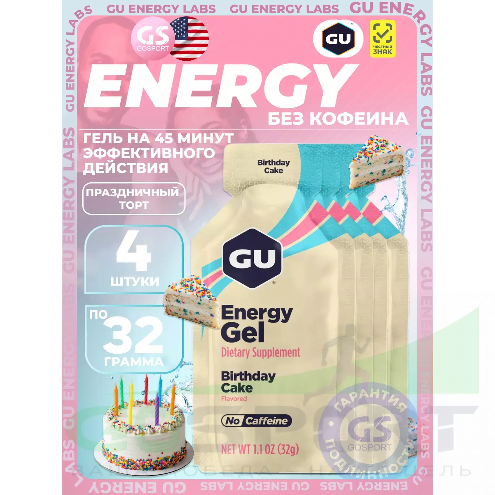 GU Energy Labs GU Original Energy Gel no caffeine 4 x 32 г, Праздничный торт — Высокая калорийность, два вида углеводов, лёгкий
