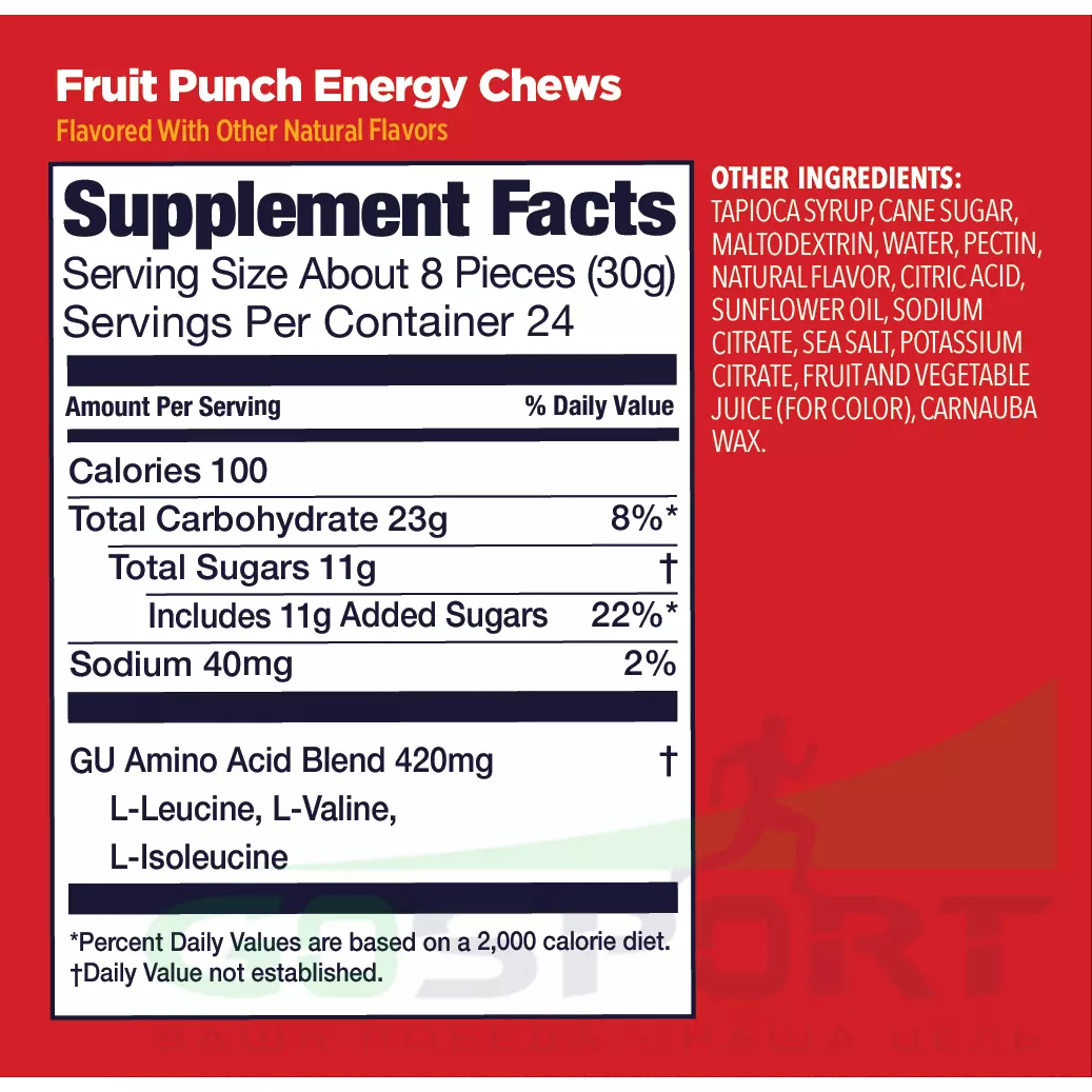 Жевательные конфеты с углеводами, электролитами и аминокислотами. Предназначены для пополнения организма энергией во время тренировок и соревнований. Содержат аминокислоты (лейцин, валин, изолейцин) для предотвращения повреждения мышц. Жевательные конфеты GU содержат в одной пачке 16 жевательных конфет внутри, как 2 полноценных геля GU Energy • Только натуральные и органические ингредиенты • Никаких искусственных красителей и консервантов • ВСАА (лейцин, валин, изолейцин) защищает мышцы и уменьшает усталость • В состав входит натрий (основной электролит) и калий • Не содержит запрещенных WADA веществ • Во время тренировки пакетик можно делить на равные порции. Всегда поддерживайте уровень жидкости в организме. Старайтесь пить каждые 15мин во время тренировки