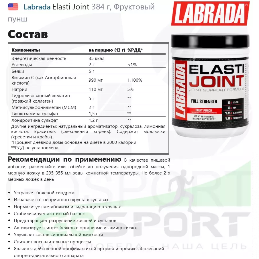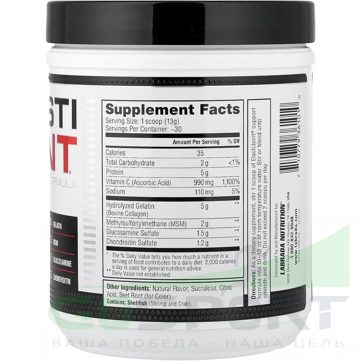Labrada Elasti Joint 384 грамма представляет собой пищевую добавку, которая широко используется профессиональными и начинающими спортсменами, а также людьми, которые придерживаются активного образа жизни. Представленный препарат разработан торговой маркой Labrada для восстановления хрящей, суставов, связок и сухожилий.