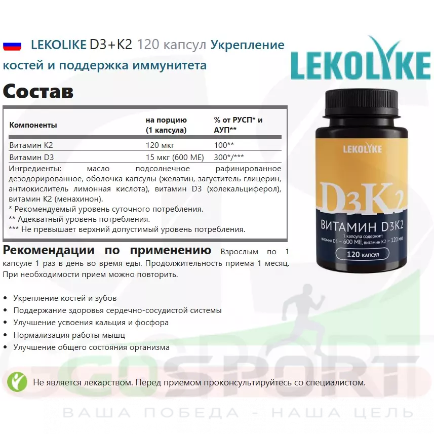 Ингредиенты: масло подсолнечное рафинированное дезодорированное, оболочка капсулы (желатин, загуститель глицерин, антиокислитель лимонная кислота), витамин D3 (холекальциферол), витамин K2 (менахинон).