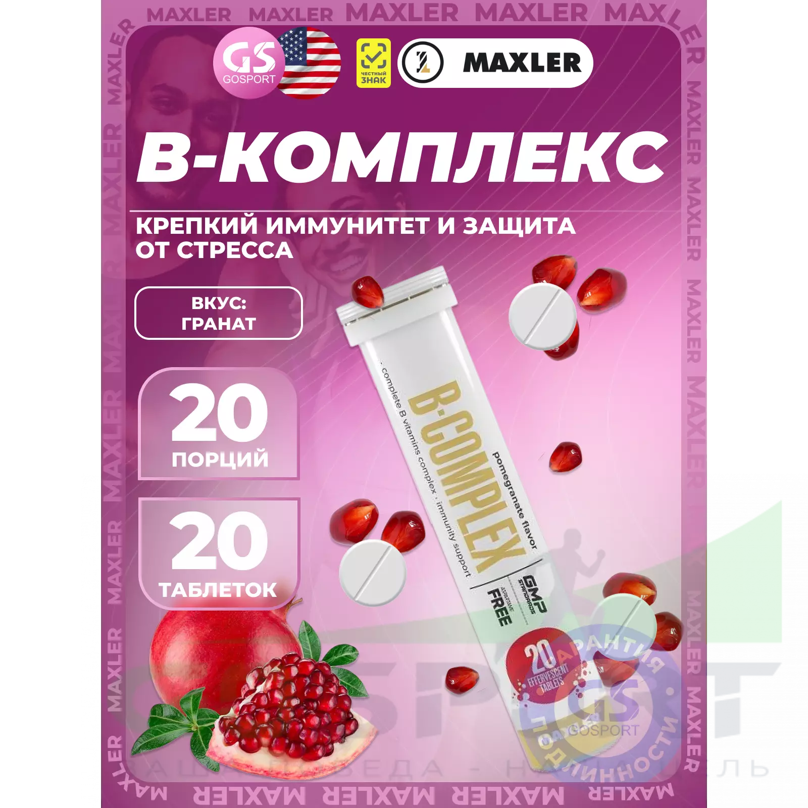 MAXLER B-Complex 20 шипучих таблеток, Гранат — для иммунитета, мозга и энергии