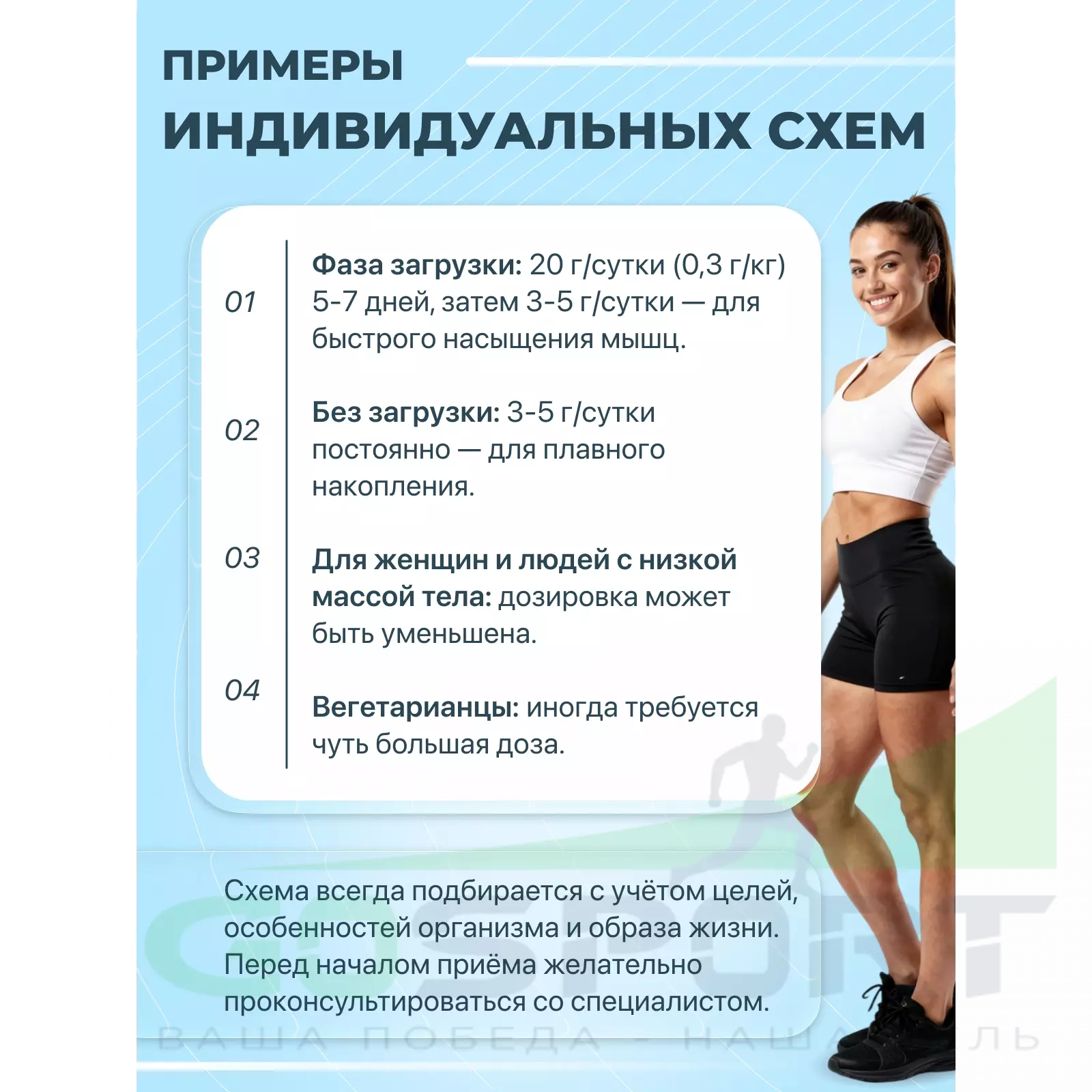 | Креатин моногидрат | 100 г | 3 г | 6 г |