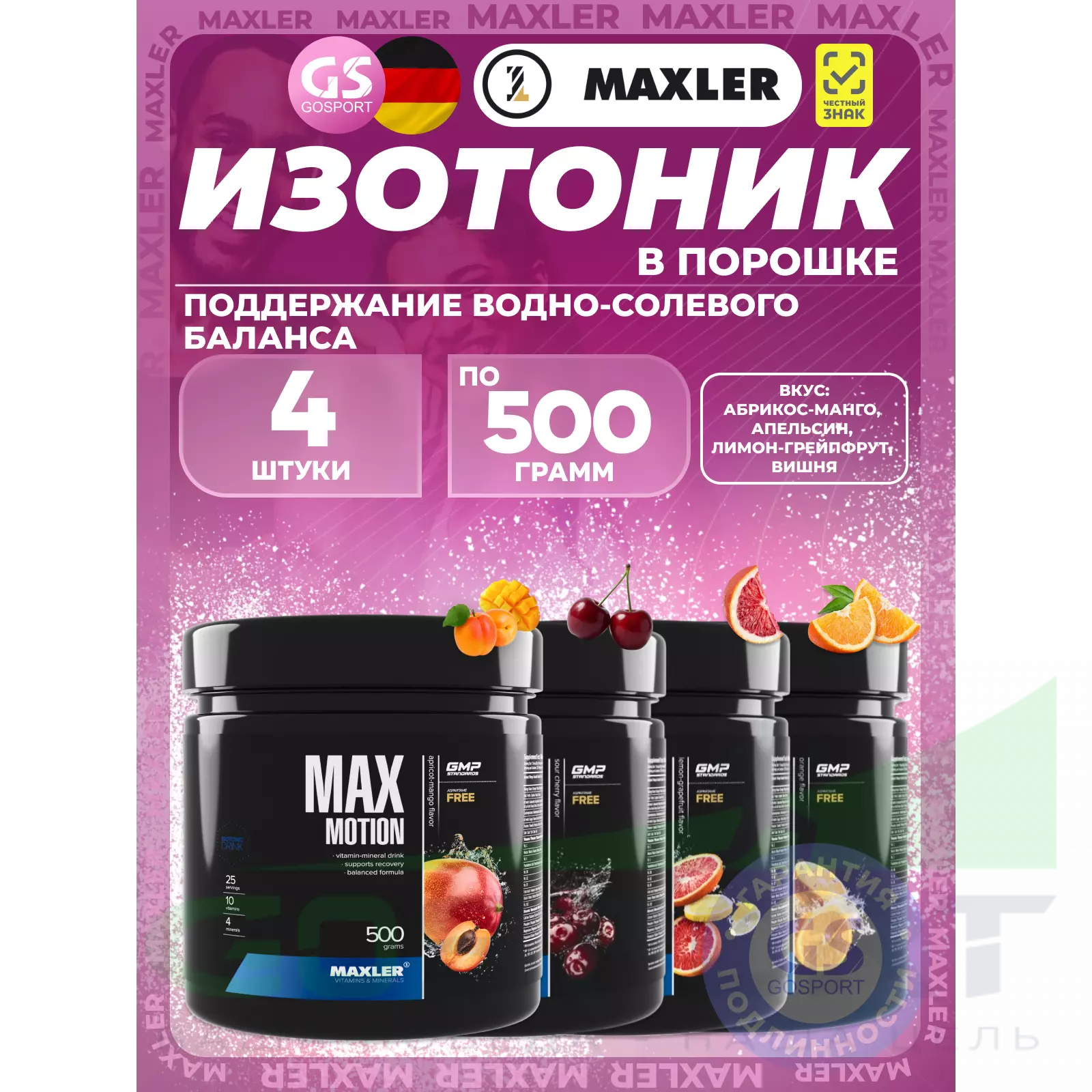 Лицензии и сертификаты Max Motion 4 х 500 г, Абрикос-манго, Апельсин, Лимон-грейпфрут, Вишня