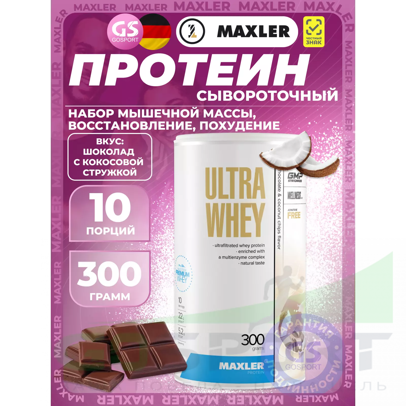 MAXLER Ultra Whey 300 г, Шоколад с кокосовой стружкой — Для роста и восстановления мышц