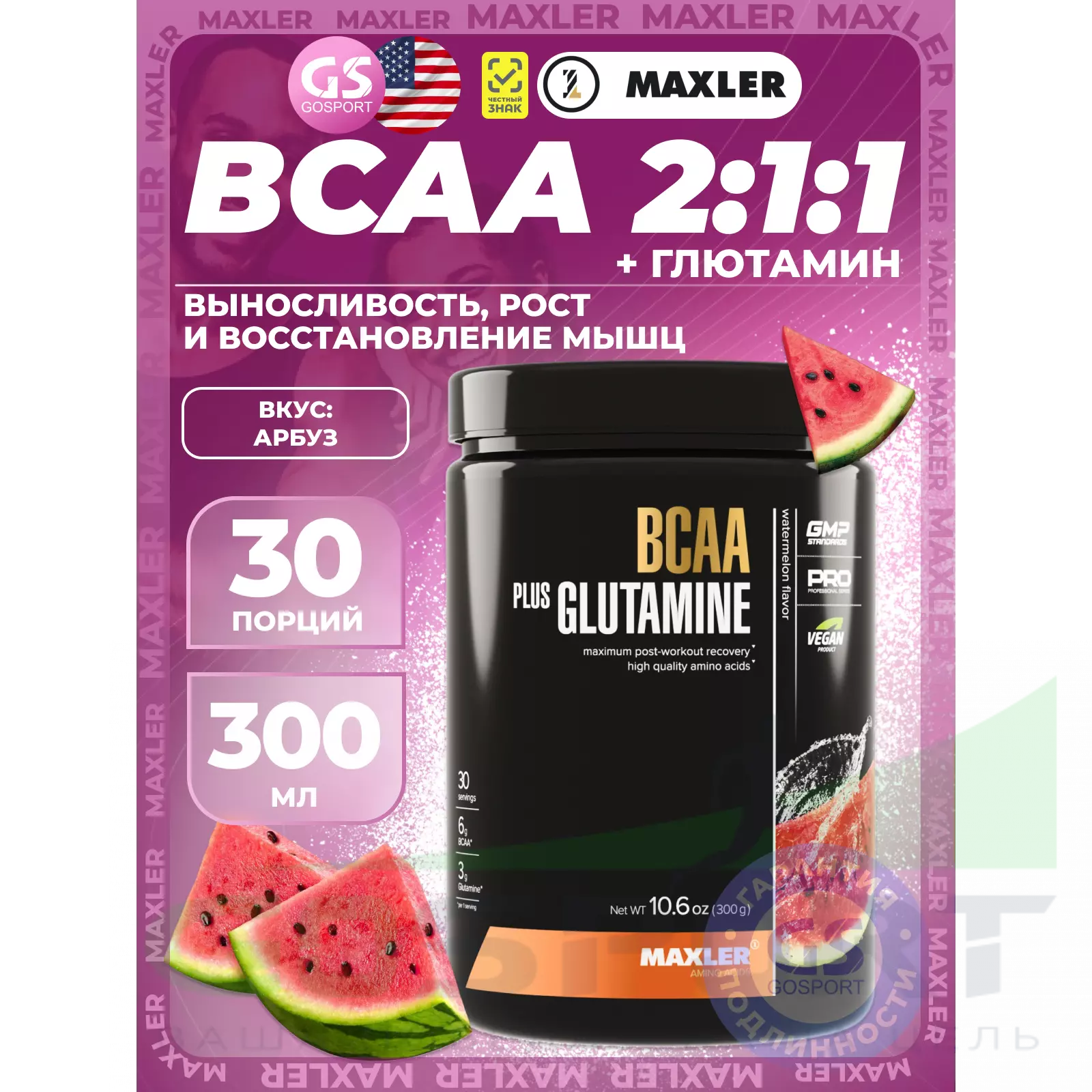 MAXLER BCAA 6000 mg + Glutamine 300 г, Арбуз — Выносливость, рост и восстановление мышц