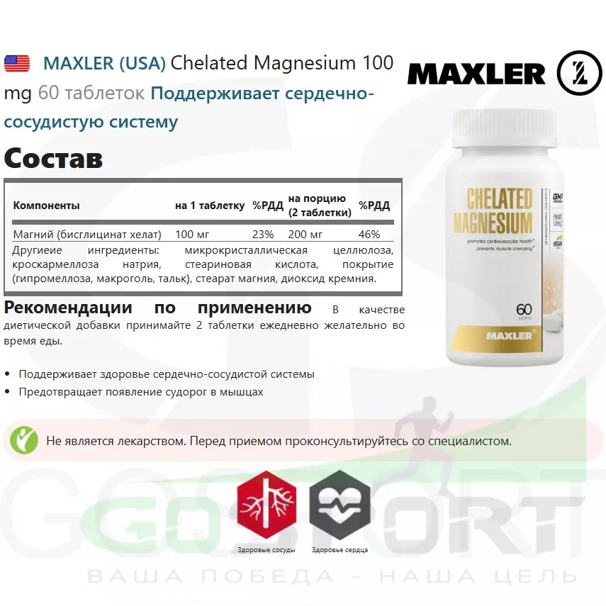 MAXLER Chelated Magnesium 100 mg 60 таблеток — Поддерживает сердечно-сосудистую систему