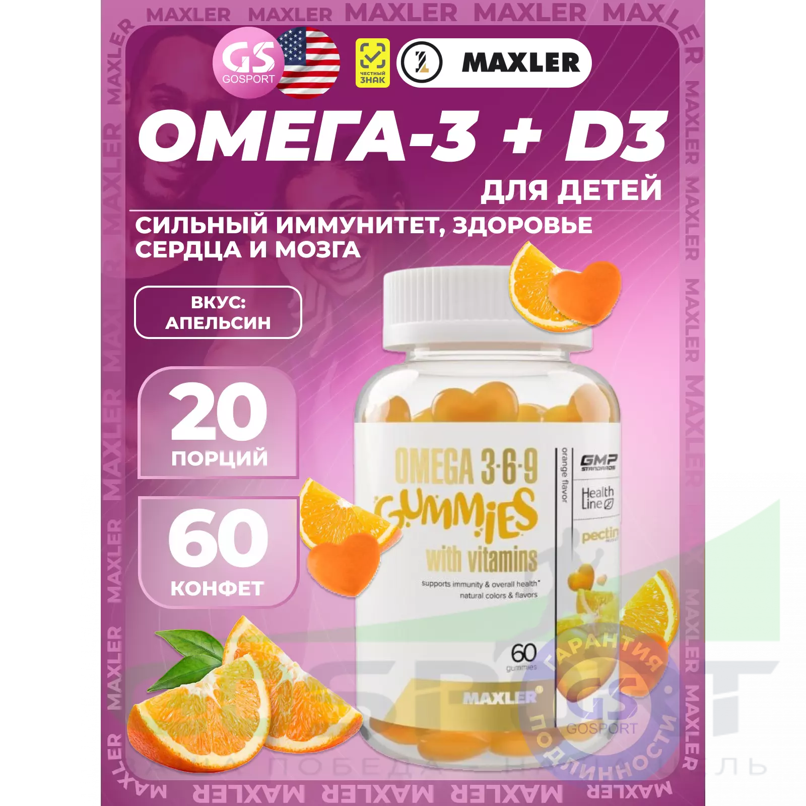 MAXLER Omega 3-6-9 Gummies 60 мармеладок, Апельсин — для здоровья сердца и мозга, поддержки иммунитета