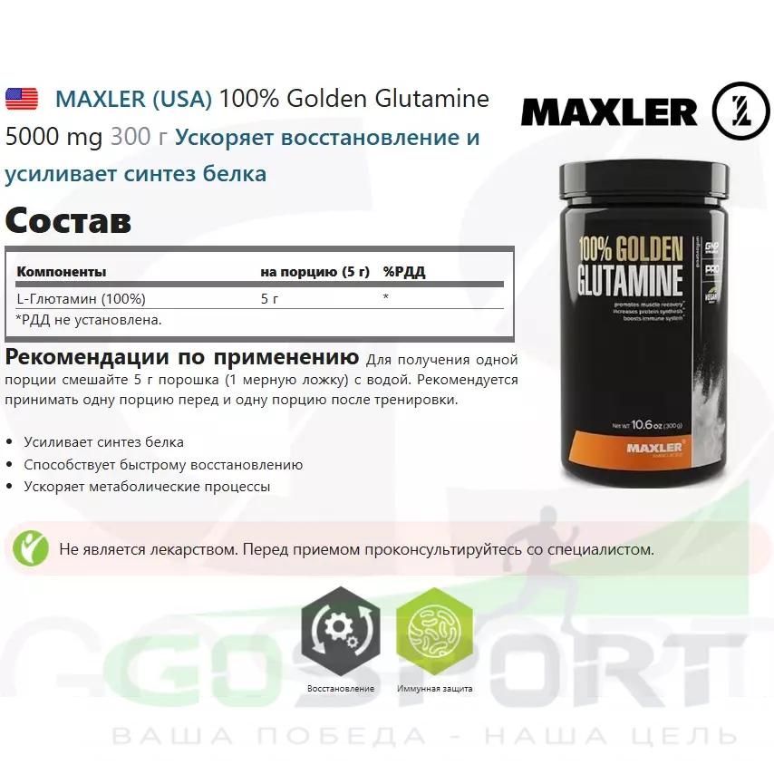 MAXLER 100% Golden Glutamine 5000 mg 300 г — Ускоряет восстановление и усиливает синтез белка