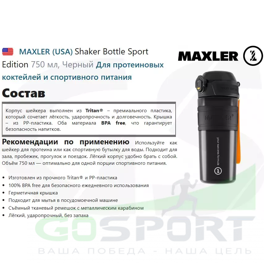 Maxler Sport Edition Shaker — выбор спортсменов и любителей фитнеса, ценящих качество и удобство. Tritan® корпус, BPA free материалы и герметичная крышка обеспечат идеальное смешивание и надёжность в любой ситуации.