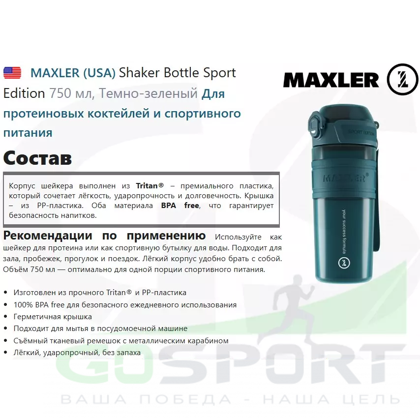 MAXLER Shaker Bottle Sport Edition 750 мл, Темно-зеленый — Для протеиновых коктейлей и спортивного питания