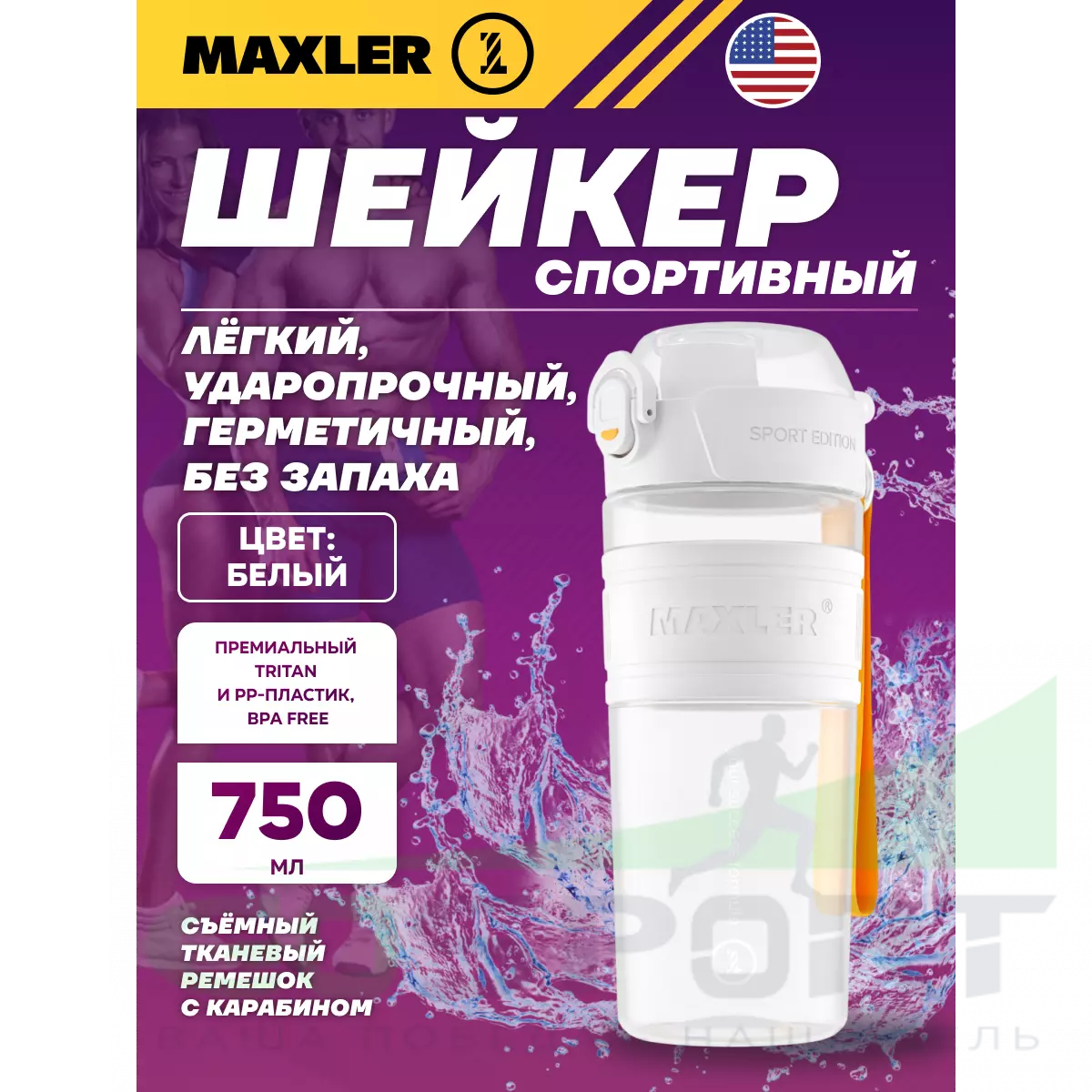 MAXLER Shaker Bottle Sport Edition 750 мл, Белый — Для протеиновых коктейлей и спортивного питания