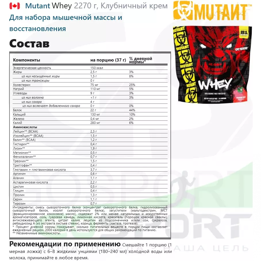 - Протеин MUTANT WHEY со вкусом клубничного крема, предназначен для роста крепких мышц, на 100% лучше, чем любой обычный сывороточный протеин. Рецептура MUTANT WHEY не сравнима ни с чем, что вы пробовали раньше.