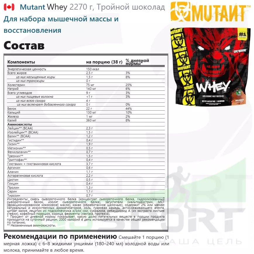 Для тяжелоатлетов и бодибилдеров рекомендуется увеличить дозировку до 3 мерных совка порошка MUTANT WHEY на один коктейль, предварительно смешав с 500 мл воды.