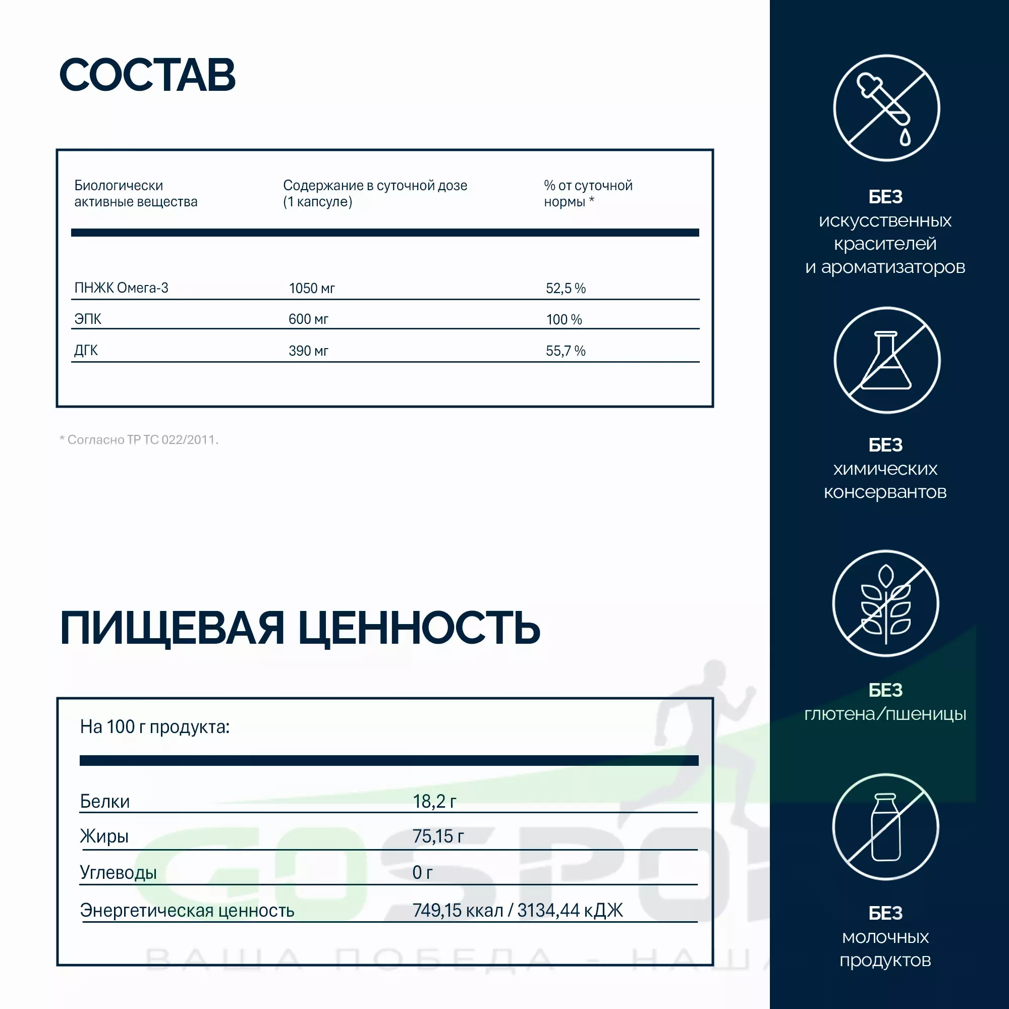 Форма Омега-3 ПНЖК – этерифицированные триглицериды имеют повышенную биодоступность Омега-3 ПНЖК (по сравнению с этиловыми эфирами), что способствует более легкому усвоению и быстрому восстановлению уровня Омега-3 в организме. Максимальная концентрация Омега-3 в 1 капсуле отлично подойдет для восполнения дефицита Омега-3 в организме.