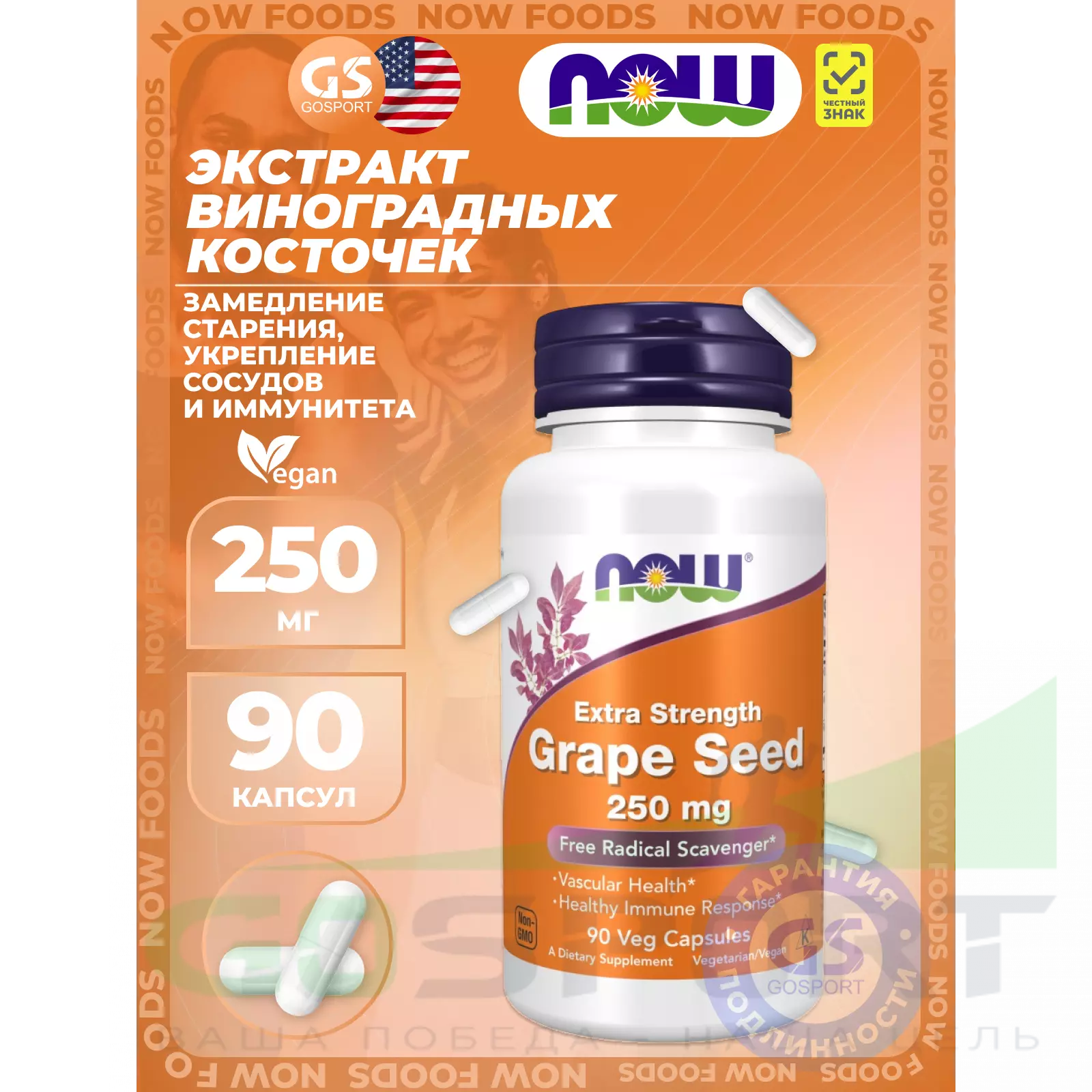 NOW Foods Grape Seed 250 mg 90 веган капсул — Замедление старения, укрепление сосудов и иммунитета