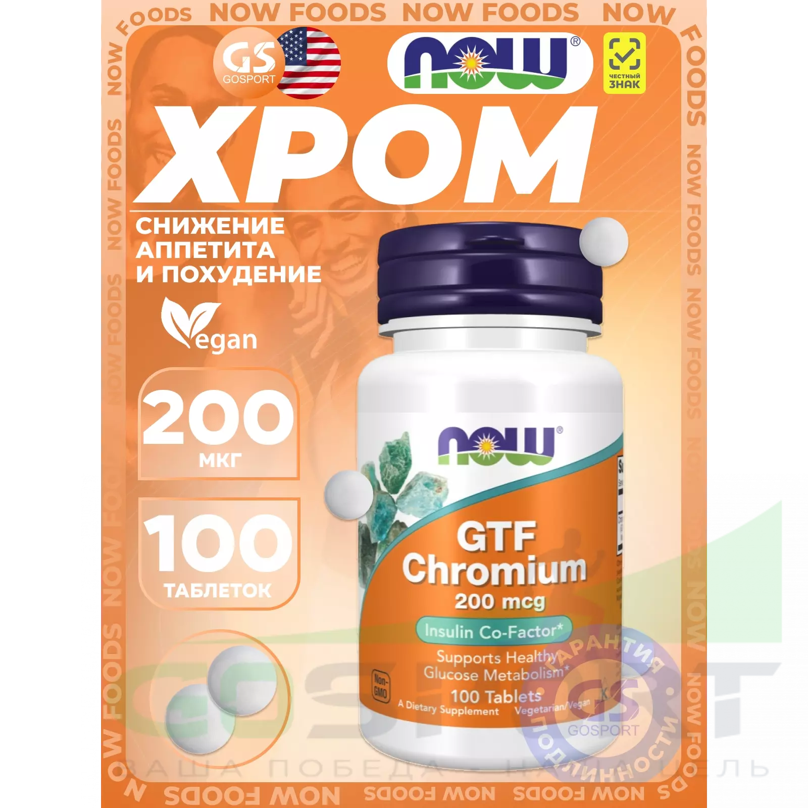 NOW Foods GTF Chromium 200 mcg 100 таблеток — Регуляция сахара, контроль аппетита и метаболизм