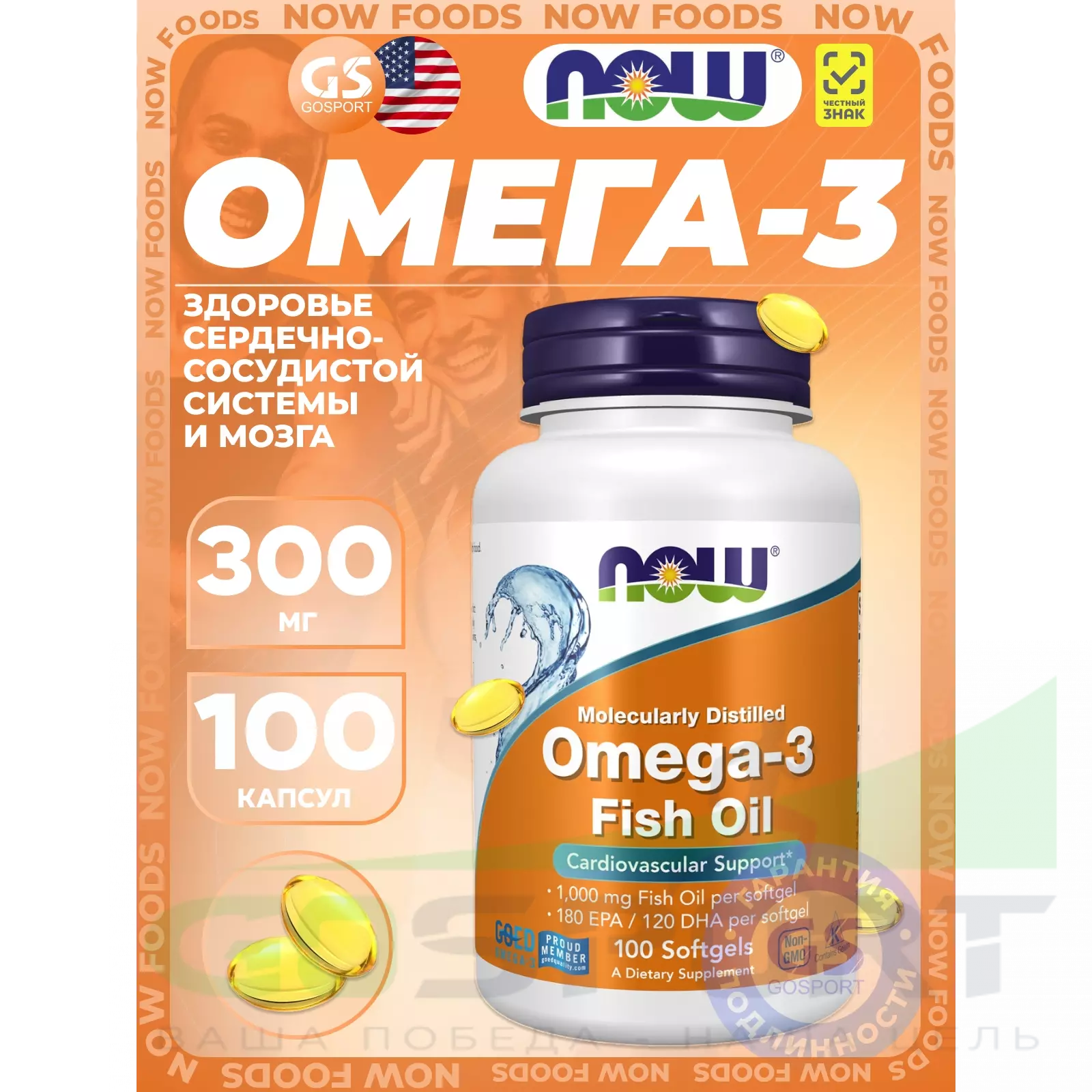 NOW Foods Omega-3 Fish Oil 1000 mg 100 гелевых капсул — Поддержка сердечно-сосудистой системы