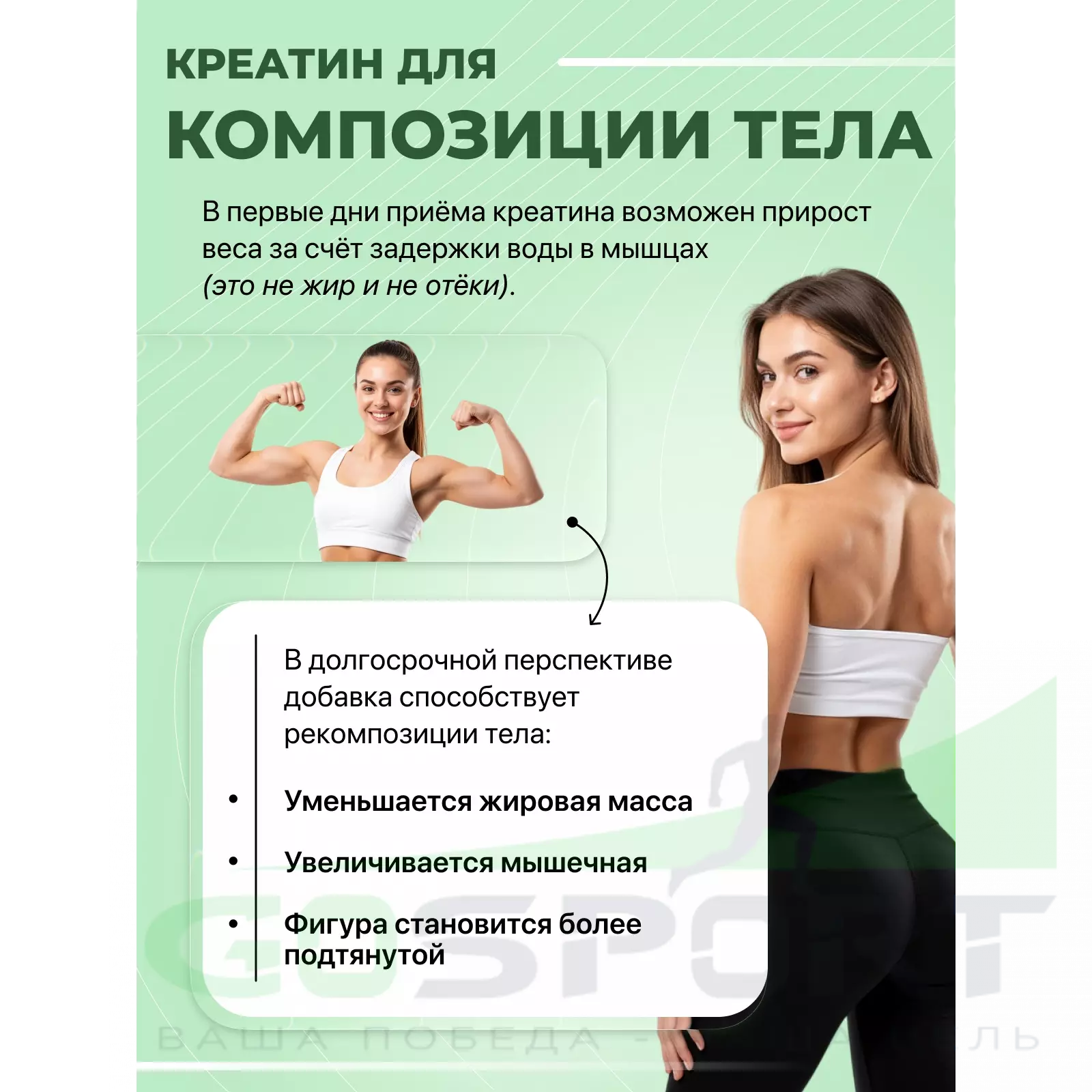 Визуальное увеличение объема мышц. Прием креатина приводит к задержке воды в мышечной ткани. Жидкость между волокнами создает эффект увеличения объема. После прекращения приема мышцы обычно уменьшаются в объеме на 20-25%, так как выводится лишняя вода.