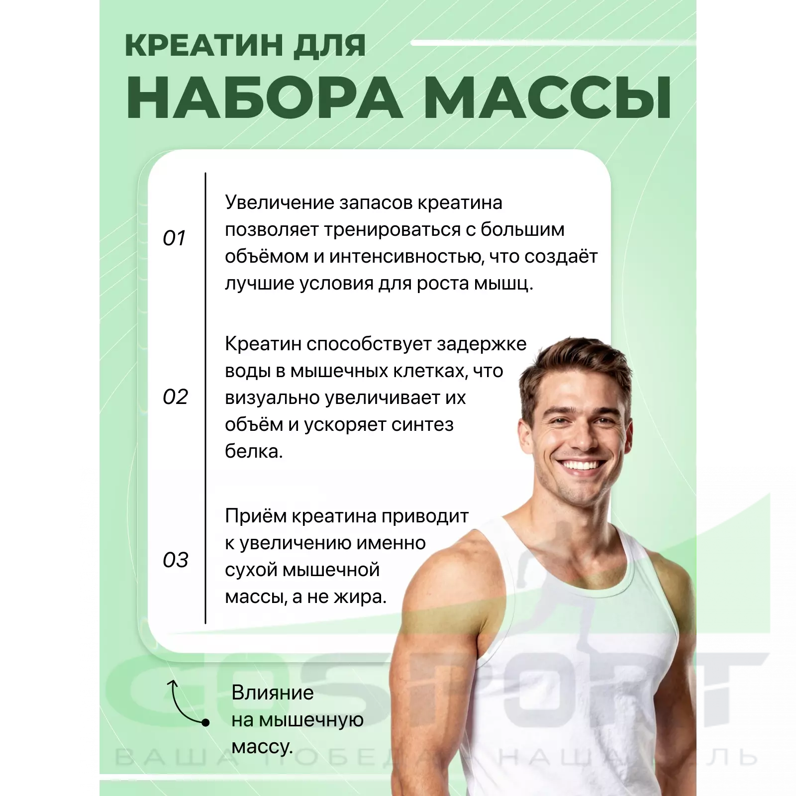 Креатин — вещество, необходимое для нормального энергетического обмена в мышечных и нервных клетках. Оно используется спортсменами для стимуляции роста мышечной массы.