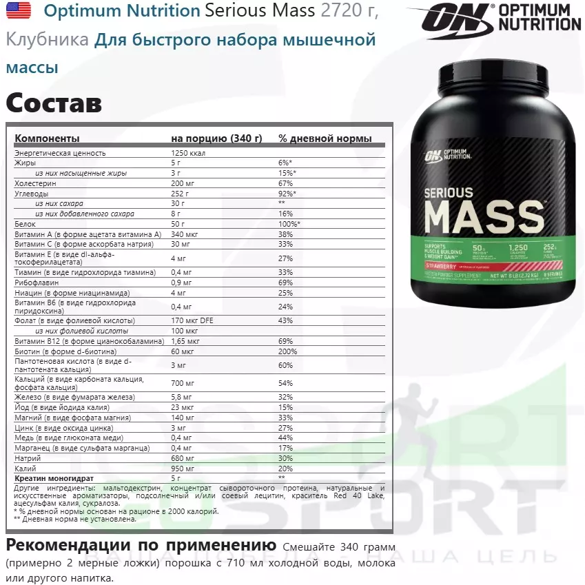 Serious Mass от компании Optimum Nutrition — это белково-углеводный продукт для набора массы. Этот многокомпонентный гейнер является комплексной высококачественной белковой смесью (сывороточный протеин, казеинат кальция, яичный альбумин). Содержит 26 витаминов и необходимых минералов, креатин, L-глютамин и пептиды. Моногидрат креатина, глютамин, холин и инозитол в составе помогают более эффективно провести тренировку. Принимать утром или во второй половине дня, до или после тренировки.