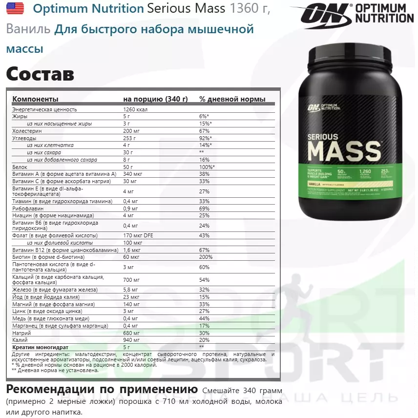 Serious Mass от компании Optimum Nutrition — это белково-углеводный продукт для набора массы. Этот многокомпонентный гейнер является комплексной высококачественной белковой смесью (сывороточный протеин, казеинат кальция, яичный альбумин). Содержит 26 витаминов и необходимых минералов, креатин, L-глютамин и пептиды. Моногидрат креатина, глютамин, холин и инозитол в составе помогают более эффективно провести тренировку. Принимать утром или во второй половине дня, до или после тренировки.