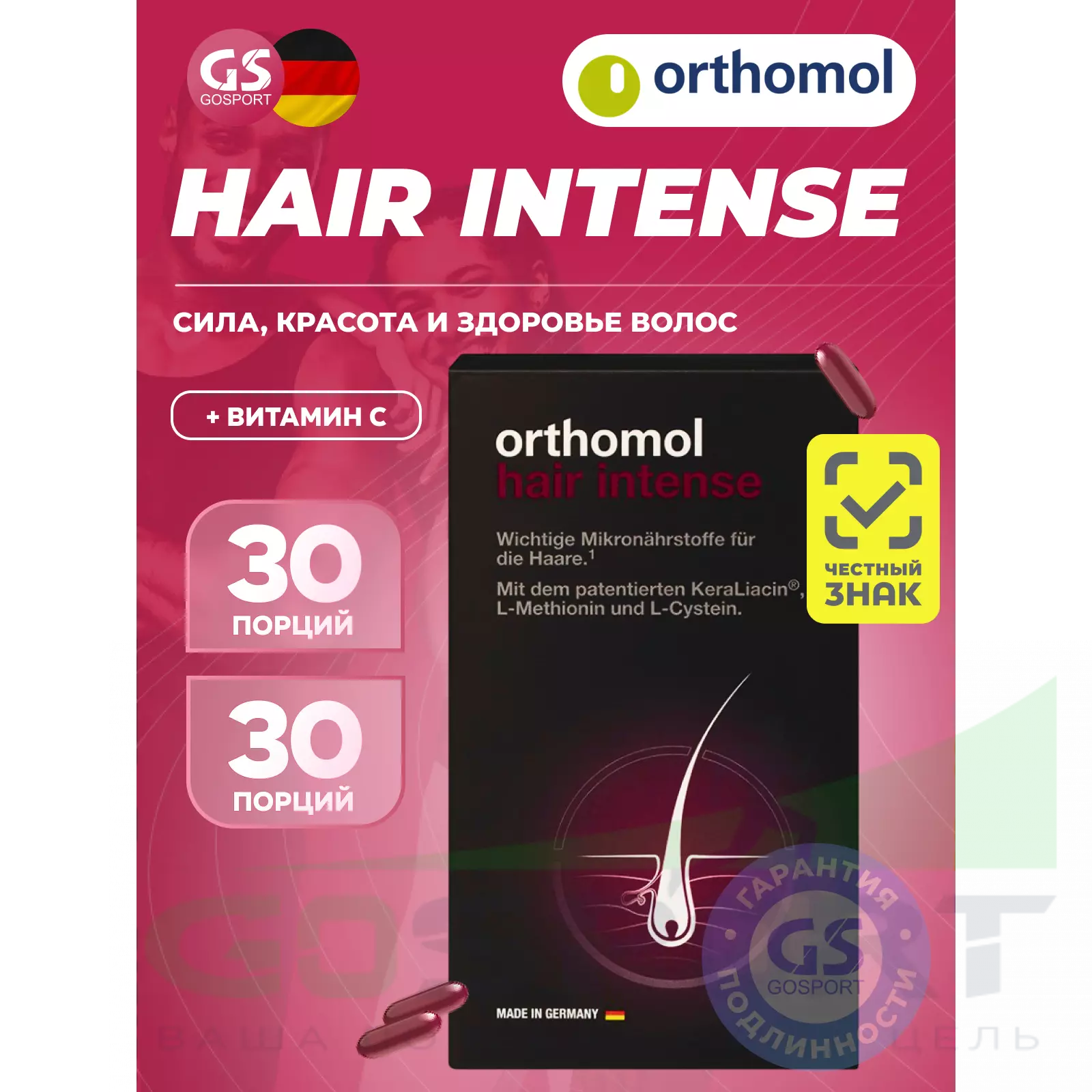 Orthomol Hair Intense объединяет важные питательные микроэлементы и витамины группы B с аминокислотами L-цистеин и L-метионин, а также запатентованный экстракт проса KeraLiacin ®, который, помимо прочего, содержит милиацин.