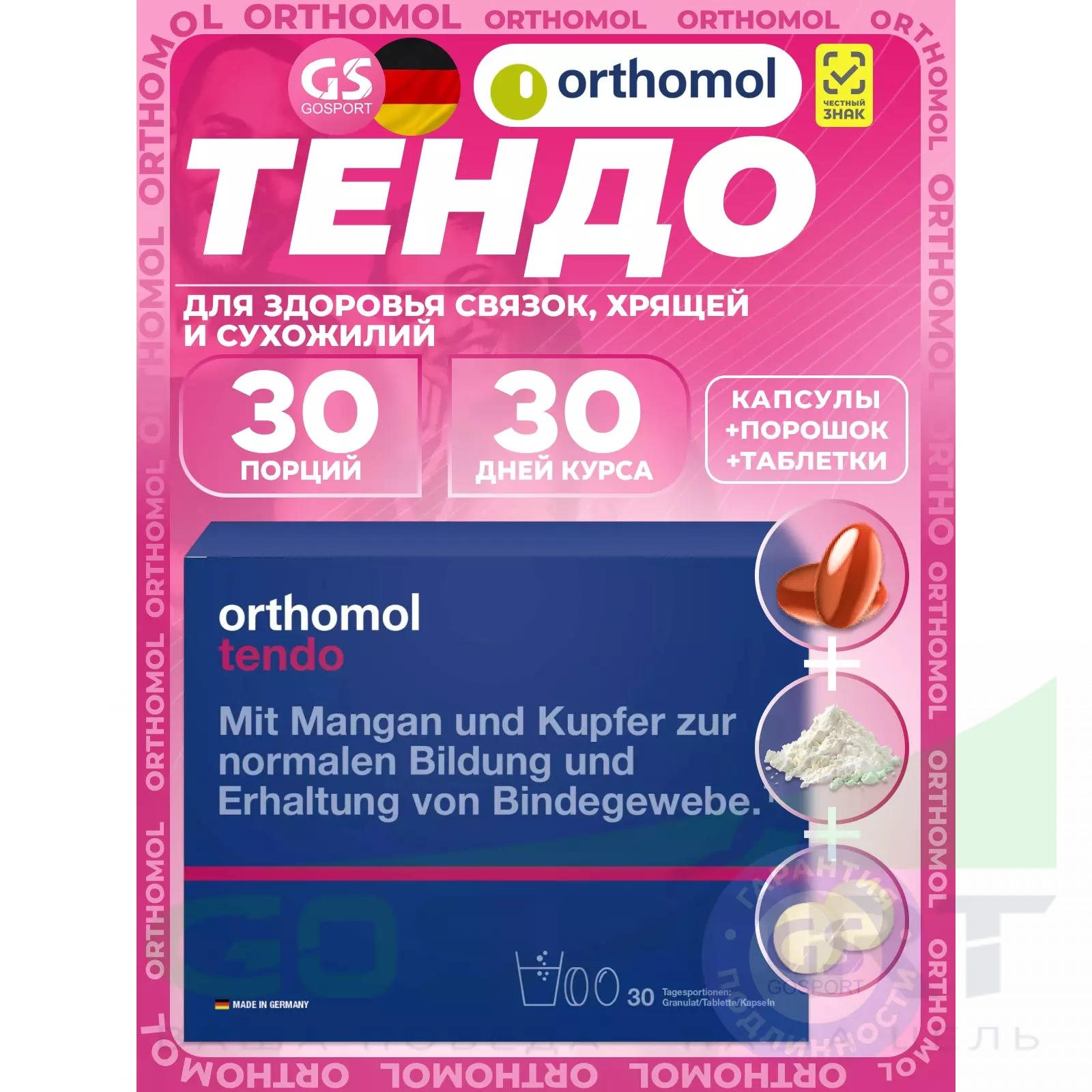 Форма выпуска Orthomol Tendo: капсулы, порошок и таблетки.