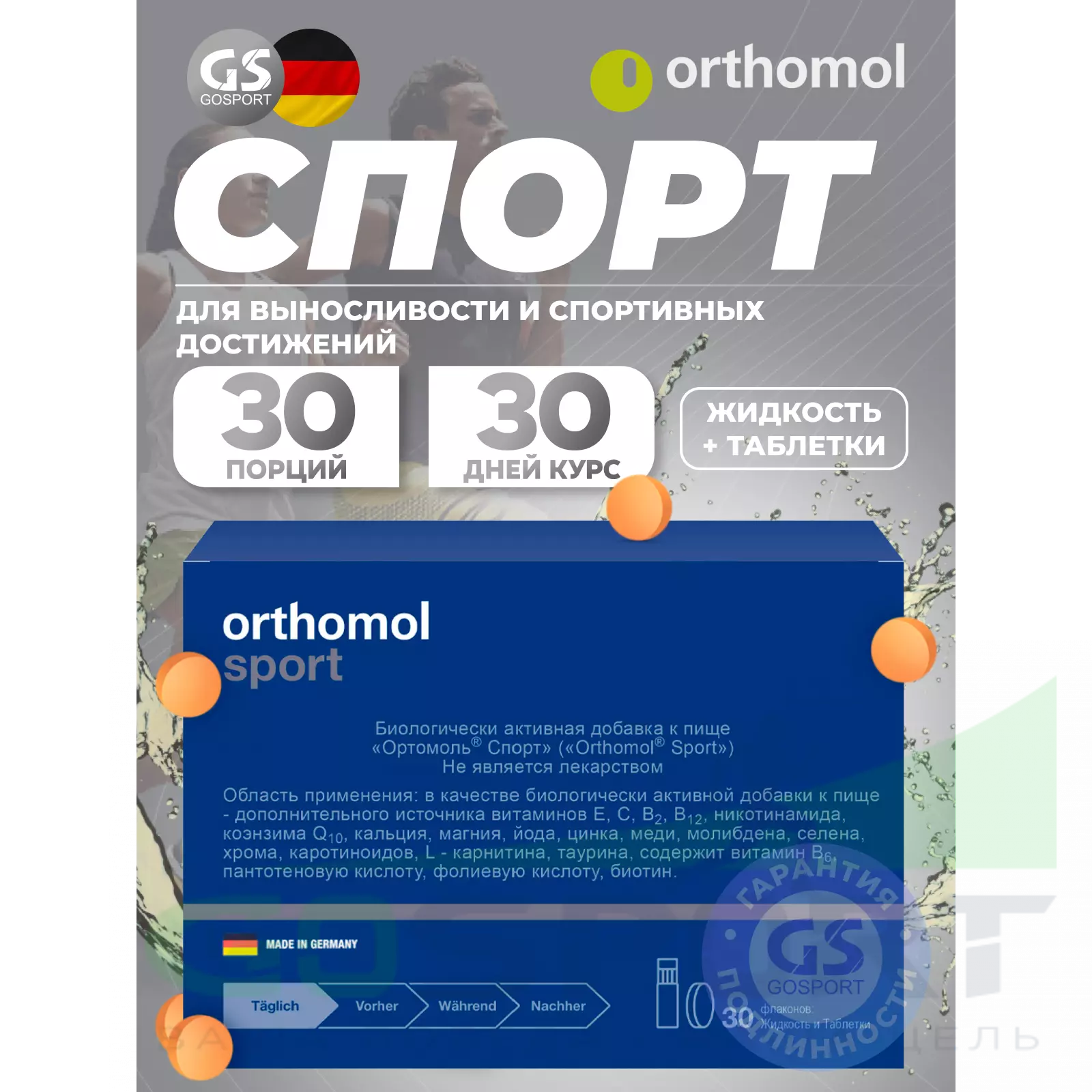 Важные указания: Orthomol Sport — это ортомолекулярный препарат для профессиональных спортсменов или людей, которые регулярно подвергаются существенным физическим нагрузкам. Принимать витаминный комплекс можно только под наблюдением врача. Не является заменой пище.