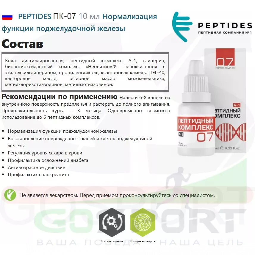 Для поддержки полноценной работы и предотвращения обменных нарушений поджелудочной железы был создан Пептидный комплекс в растворе № 7. Он содержит натуральный пептид поджелудочной железы (А-1), способствующий нормализации углеводного обмена при повышенной толерантности к глюкозе и сахарном диабете, а также улучшает синтез пищеварительных ферментов клетками поджелудочной железы. Также способствует нормализации процессов пищеварения (уменьшается вздутие, тяжесть в животе и другие симптомы внешнесекреторной недостаточности).