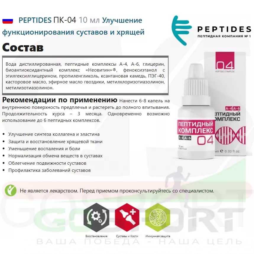 Для профилактики остеоартрита и в качестве помощника при комплексной терапии представляем Пептидный комплекс № 4 с натуральными пептидами Т-звена иммунной системы и хрящей, выделенными из тканей животных.