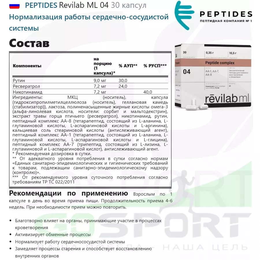 Ингредиенты: МКЦ (носитель), капсула (гидроксипропилметилцеллюлоза (носитель), геллановая камедь (стабилизатор)), лактоза, полиненасыщенные жирные кислоты омега-3 (альфа-линолевая кислота, носители: сорбит и мальтодекстрин), экстракт травы горца птичьего (ресвератрол), никотинамид, рутин, пептидный комплекс АА-8 (тетарапептид, состоящий из L-аланина, L-глутаминовой кислоты, L-аспарагиновой кислоты и L-аргинина), кальциевая соль стеариновой кислоты (антислеживающий агент), пептидный комплекс АА-1 (тетарапептид, состоящий из L-аланина, L-глутаминовой кислоты, L-аспарагиновой кислоты и L-глицина), пептидный комплекс АА-7 (трипептид, состоящий из L-лизина, L-глутаминовой и L-аспарагиновой кислот), антислеживающий агент.