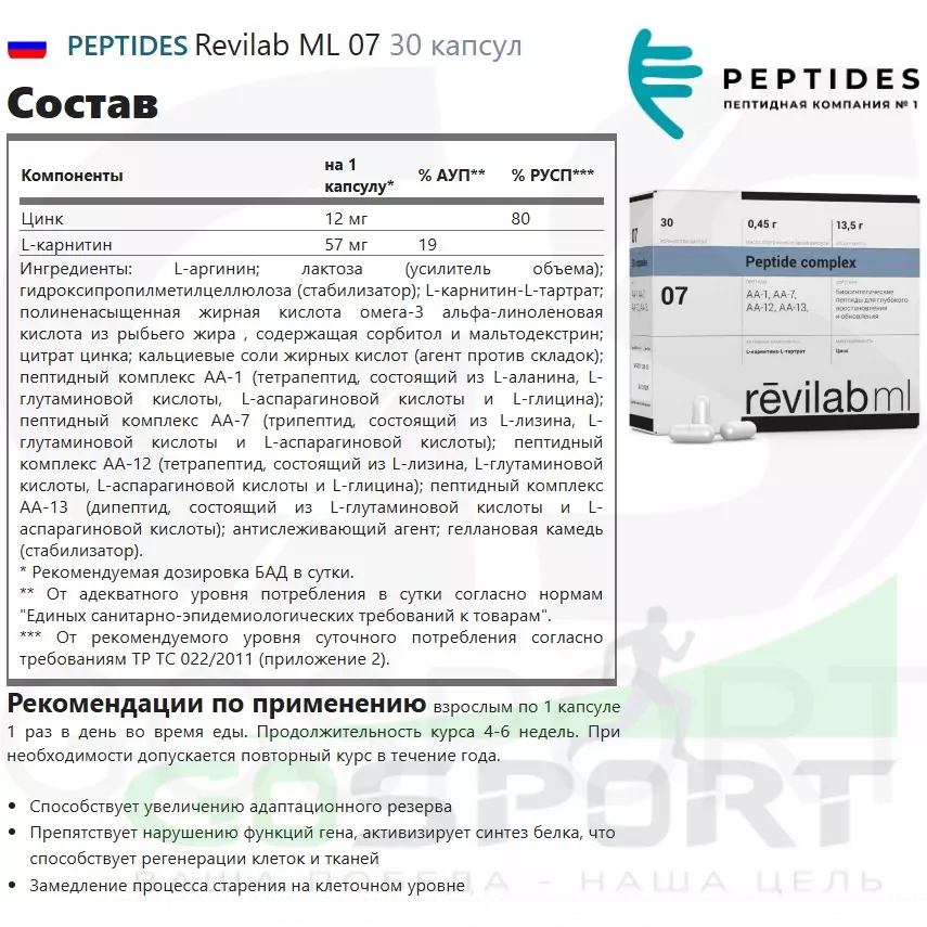 Ингредиенты: L-аргинин; лактоза (усилитель объема); гидроксипропилметилцеллюлоза (стабилизатор); L-карнитин-L-тартрат; полиненасыщенная жирная кислота омега-3 альфа-линоленовая кислота из рыбьего жира , содержащая сорбитол и мальтодекстрин; цитрат цинка; кальциевые соли жирных кислот (агент против складок); пептидный комплекс АА-1 (тетрапептид, состоящий из L-аланина, L-глутаминовой кислоты, L-аспарагиновой кислоты и L-глицина); пептидный комплекс АА-7 (трипептид, состоящий из L-лизина, L-глутаминовой кислоты и L-аспарагиновой кислоты); пептидный комплекс АА-12 (тетрапептид, состоящий из L-лизина, L-глутаминовой кислоты, L-аспарагиновой кислоты и L-глицина); пептидный комплекс АА-13 (дипептид, состоящий из L-глутаминовой кислоты и L-аспарагиновой кислоты); антислеживающий агент; геллановая камедь (стабилизатор).