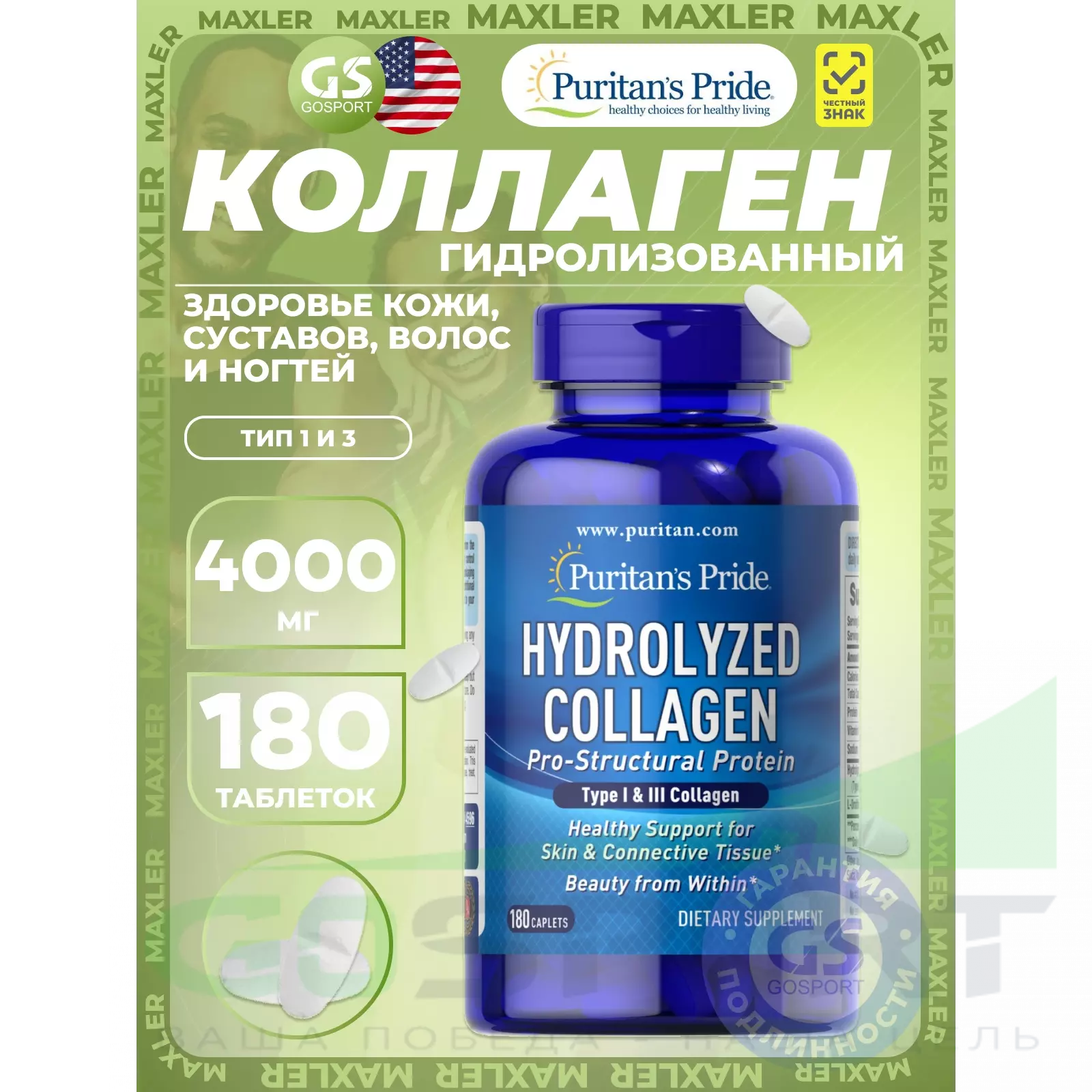 Puritan's Pride Collagen Hydrolyzed 4000 mg 180 таблеток — Здоровье кожи, суставов, волос и ногтей