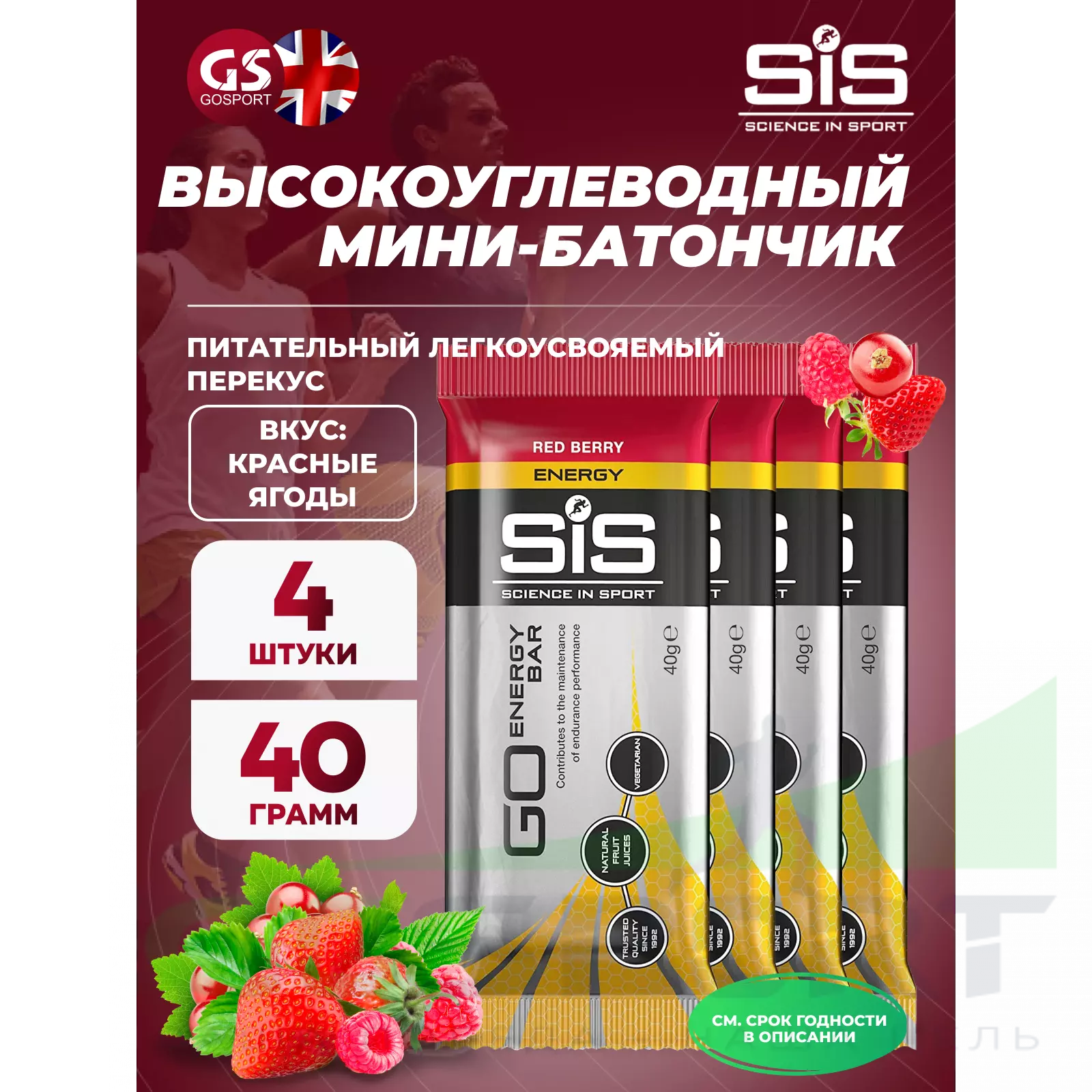 SCIENCE IN SPORT (SiS) Go Energy Bar 4 x 40 г, Красные ягоды — Питательный легкоусвояемый перекус