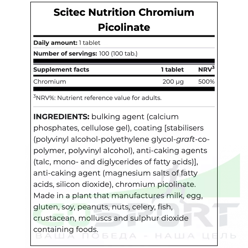 С каждой порцией Chromium Picolinate от Scitec Nutrition вы получите 200 мкг пиколината хрома - соединения пиколинавой кислоты и хрома, являющегося одним из важнейших микроэлементов. Организм нуждается в хроме для нормального метаболизма макроэлементов и для поддержания уровня глюкозы в пределах нормы. Хром ценен и в вопросах уменьшения веса, контролируя метаболизм глюкозы.