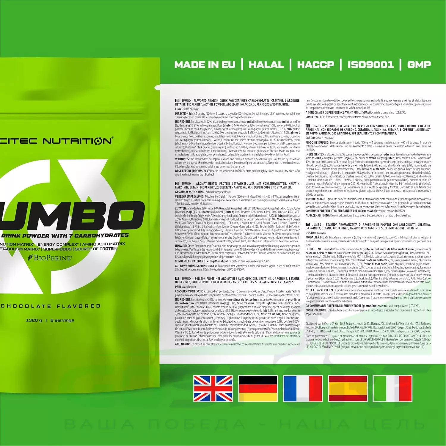 JUMBO означает БОЛЬШОЙ! JUMBO означает СИЛЬНЫЙ! Исследования показывают, что люди недооценивают значение питательных веществ во время диеты, но в то же время и переоценивают продукты питания при попытке нарастить мышечную массу. Другими словами, они едят меньше, чем считают необходимым, и поэтому нуждаются в большем количестве питательных веществ для устойчивого и значительного прогресса! Каждый стремится найти чудесное средство, игнорируя тот факт, что нет ничего более мощного, чем последовательное потребление надлежащего количества калорий - углеводов для энергии и белка для питания мышц. Следует также учесть тот факт, что многие спортсмены не тратят время на подсчет питательных веществ в пище, и единственным практическим решением для большинства остается полагаться на ежедневное использование коктейля JUMBO, которое в значительной степени гарантирует, что вы будет иметь достаточное количество питательных веществ в вашем рационе, чтобы добиться успеха. С 50 граммами самого высококачественного протеина в порции, и углеводами как быстрого, так и медленного действия. JUMBO использует быстроусваиваемый сывороточный протеин, чтобы снабжать мышцы необходимым для них белком до, во время и после тренировки. Кроме того, наличие обыкновенной, так называемой твердой пищи в рационе питания означает, что медленно перевариваемые источники белка выпускают аминокислоты в кровь в течение длительного времени (4-6), поэтому должны использоваться пищевые добавки с быстроусваиваемыми источниками белка. В отличие от многих других гейнеров JUMBO не содержит каких-либо подсластителей!